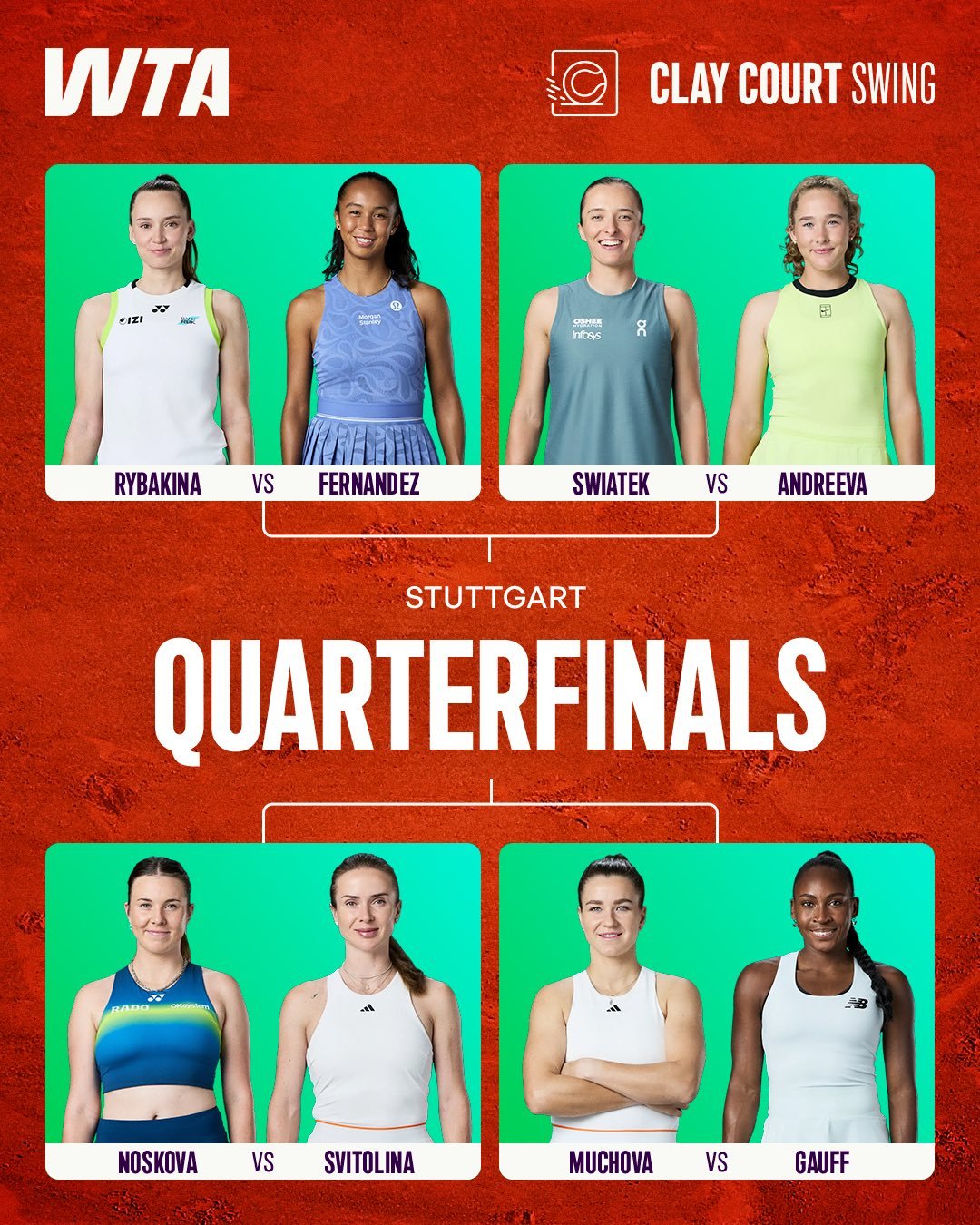 【1】莱巴金娜vs费尔南德斯(2-2)【3】斯瓦泰克vs安德列娃【6】(1-2)诺斯科娃vs斯维托丽娜【4】(2-0)【7】穆霍娃vs高芙【2】(0-6)