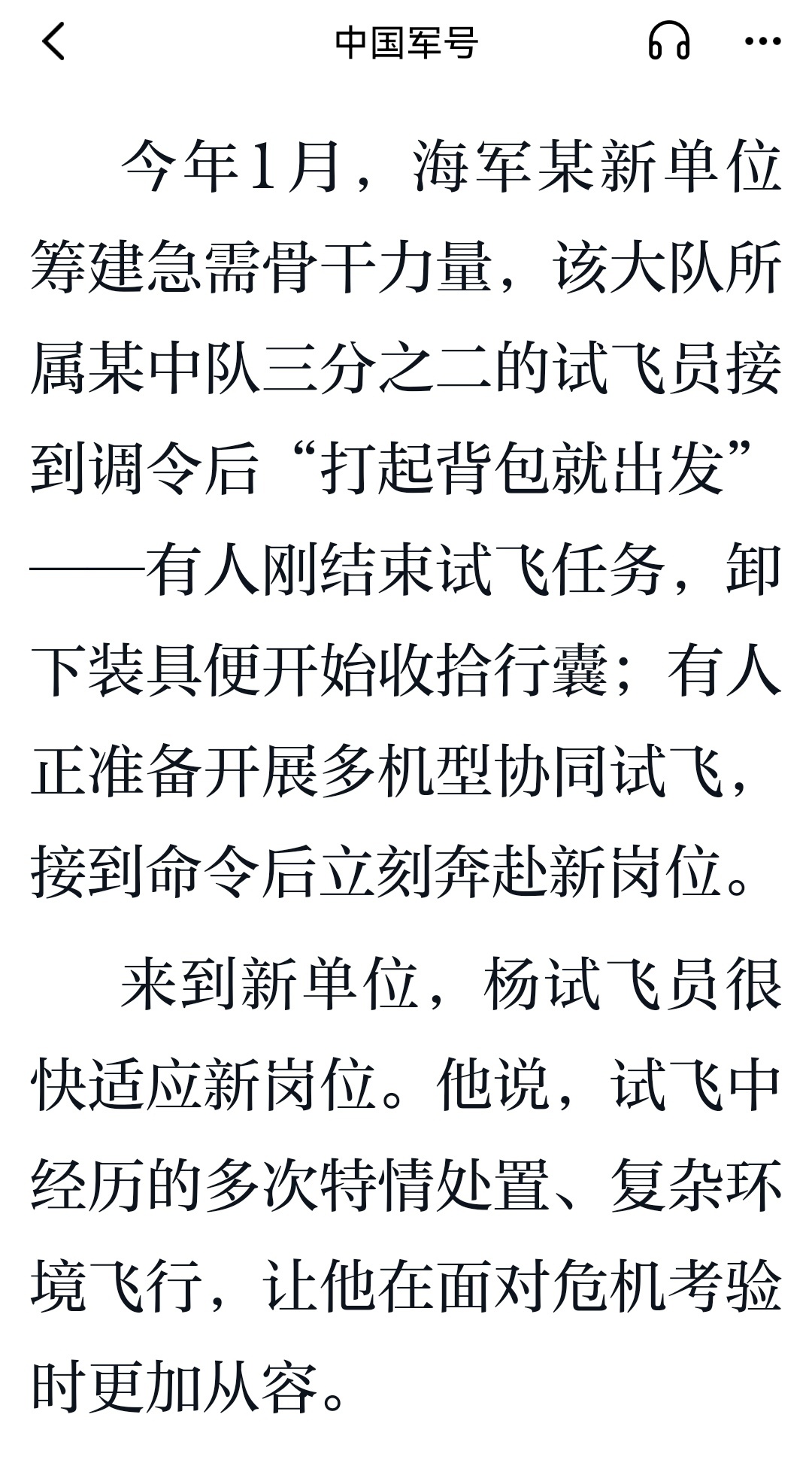 今年1月,海军某新单位筹建急需骨干力量,该大队所属某中队三分之二的试飞员接到调令后“打起背包就出发”。