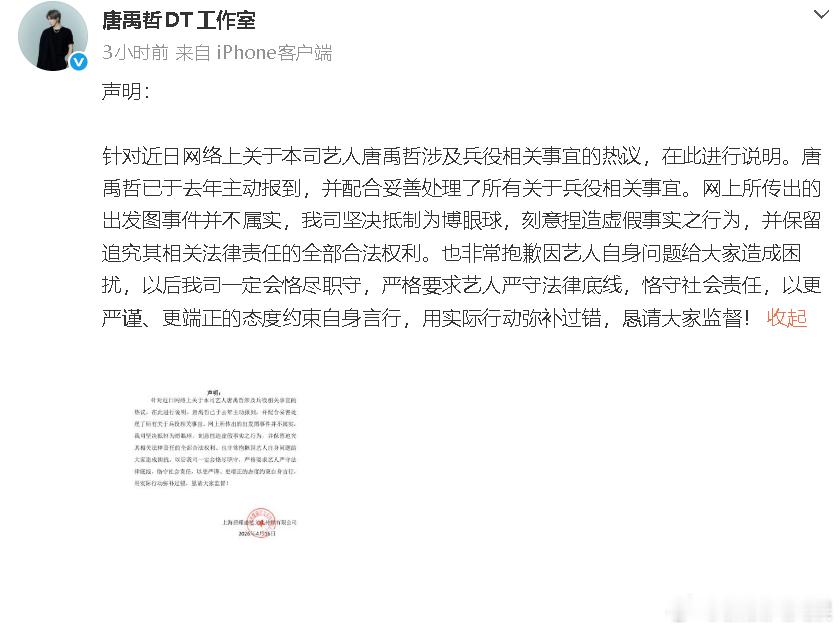 唐禹哲工作室声明唐禹哲已于去年主动报到 17日,发声明回应兵役相关事宜的热议,称唐禹哲已于去年主动报到,并配合妥善处理了所有关于兵役相关事宜。网传的“自首前还拍出发图”并不属实:“我司坚决抵制为博眼球,刻意捏造虚假事实之行为,并保留追究其相关法律责任的全部合法权利。”