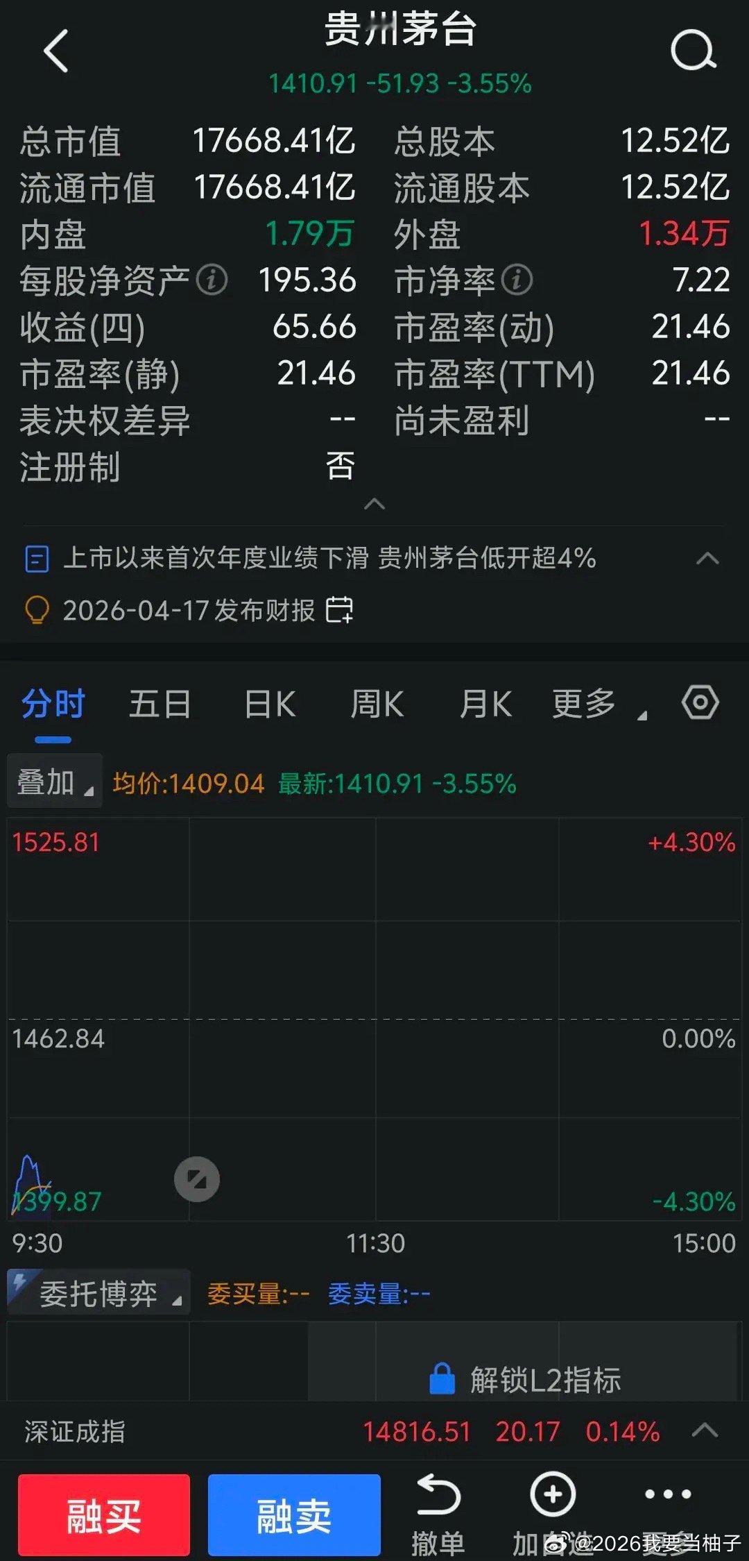 贵州茅台一季报营收、利润双降,今日开盘股价大跌4.30%,后有回升,目前下跌3.55%。连贵州茅台都顶不住白酒的寒冬,其他白酒股业绩会下降的更多,股价会跌的更惨。白酒股前几年大涨后谁接的盘?除了少数股民,大部分都被基民接盘了。现在主力机构利用把股价炒高后,总市值偏大基金被动增持的漏洞,基金成为收割对象,所以买基金一定要甄别和谨慎。我三年前开始连续发文,提示买基金的风险。现在主力机构疯狂炒作科技股,跟几年前炒作白酒股都是一个套路,拉高股价后不用担心散户不来接盘,因为有哪些基金要被动接盘,他们还有有机会获利出逃的。所以现在你买基金要睁大眼睛,甄别基金都买了些什么股票,像买了光模块、芯片类股票的基金,最好少碰,不然又会重走买白酒基金的老路,到了牛市股价照样跌跌不休。