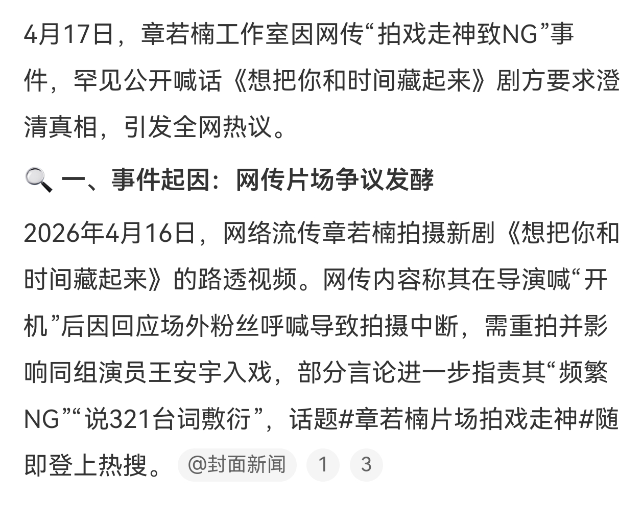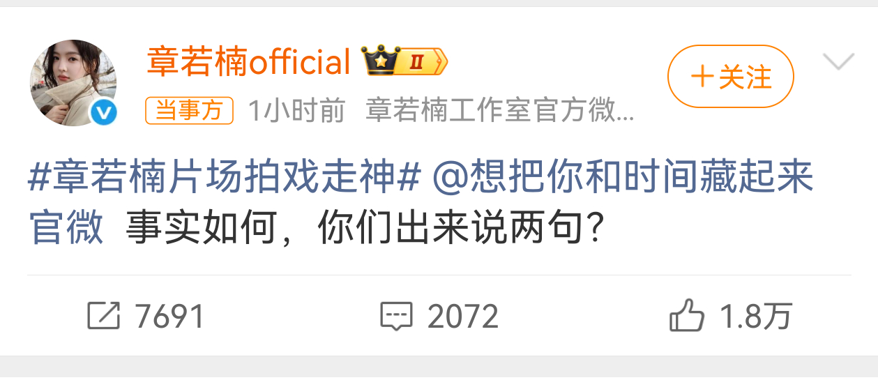 章若楠工作室喊话剧方章若楠工作室喊话剧方,关于和王安宇拍摄新剧路透时候的NG传