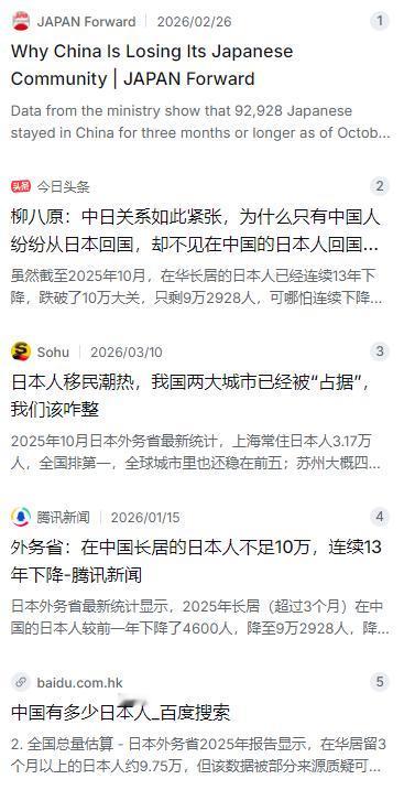 中日关系如此紧张,为什么只有中国人纷纷从日本回国,却不见在中国的日本人回国。 说白了,就一个原因:不是他们不想走,而是大多数人“走不了,也不敢走”。 麻烦看官老爷们右上角点击一下“关注”,既方便您进行讨论和分享,又能给您带来更多优质的内容,感谢您的支持! 这段时间中日关系确实挺紧张的,2026年4月刚出的日本《外交蓝皮书》就把中日关系定位从“最重要的双边关系之一”降成了“重要邻国”,台面上火药味越来越浓。但有意思的是,在这个节骨眼上,朋友圈和新闻里刷到最多的,是中国人纷纷从日本往回跑——留学生、技术员、研修生,一个个拖着行李箱往回赶。可反过来说,却基本看不到在中国的日本人出现什么“撤离潮”。上海的日式居酒屋照常营业,古北的日文招牌一个没拆,该上班的上班,该送孩子上学的送孩子上学。说实话,不是他们不想走,而是绝大多数人,走不了,也不敢走。 咱们先看看中国人回国的这股风是怎么刮起来的。一个直接原因是安全层面的信号。2025年11月14日,外交部先发声,提醒中国公民日本社会治安不靖、针对中国人的案件多发,文旅部和教育部也跟着发了提醒,航司开通免费退改,没过多久12条中日航线彻底取消。数据上也确实有反应,2025年12月中国公民赴日34.87万人,比前一年同月少了差不多四成。机场里拖着箱子赶回国的人排成长队,这画面大家网上都刷到过。 但真正的大头还是留学生回流。据教育部统计,2025年回国留学生达到53.56万人,比2024年增加了4万多人,比2023年增加了12万,而且超过87%的留学生都选择回国发展。这里面原因很实在,一方面是国际形势变了,美国那些传统留学目的地不确定性增加,另一方面是国内的机会确实多起来了,AI、新能源、生物科技这些领域发展快,薪资待遇连续六年往上涨,三线和四线城市接收海归的比例也都在大幅增长。说白了,回国能拿到的条件和发展空间,跟出去的时候已经不是一个量级了。 那话说回来,在华的日本人怎么就不动呢?首先要搞清楚一个基本事实——在华日本人的底子本来就不大。日本外务省最新数据显示,截至2025年10月,长期住在中国(三个月以上)的日本人才9万2928人,连续13年下降,比2012年巅峰期15万多人少了一大截。而且这些人里面,70%以上是日企派驻的高管、技术员,还有就是自己做生意的,全是靠中国市场吃饭的群体。全球海外日本人总数已经开始回升了,中国这边的数字却还在往下掉,说明不是别人不想留,而是走的一直在走,剩下来的全是走不了的。 那“走不了”最核心的原因是什么?钱和饭碗。在上海、苏州这些地方长期派驻的日本高管,生活中有一道金手铐,叫“驻外津贴”。公司给他们报销江景公寓的房租,给孩子上一年学费几十万的国际学校,出入有专车,周末打高尔夫——这种生活水准,在日本本土除非是真正顶层的阶层,否则根本别想。要是响应号召撤回日本,最好的结果就是回到总公司挤在格子间里,工资砍掉一大半,然后面对东京高昂的物价和永远还不完的房贷。 而且不光是钱的问题,职业上也是死胡同。在中国深耕了十几年积累的市场经验和人脉,在东京总部的晋升体系里根本不算数,甚至被当成“非主流”经验被边缘化。日本厚生劳动省的数据也证实了这一点,日本人均实际工资已经连续4年下降,2025年降幅达到1.3%,物价却蹭蹭往上涨,核心CPI连续超过54个月超过2%的目标。40岁以上的中层管理一旦从中国撤回,大概率只能降薪降级,甚至直接面临失业。那些自己在中国做生意的小企业主就更别提了,供应链、客户、市场全在中国,回到日本等于从头开始,根本没那个空间。 除了经济上的走不了,还有一层是不敢走。很多日本人已经在华生活了十年以上,日子早就过得比在日本还舒坦。上海的长宁古北、虹桥这些地方,几乎凭空建出了一个比日本还日本的社区——有讲日语的诊所,有地道的居酒屋和拉面店,甚至社区服务都细致到考虑日本家庭泡澡的习惯。移动支付、外卖、便捷的交通、安全到可以半夜独自走路的大街——这些在中国习以为常的东西,回日本反而没了。一个在上海可以活得自由自在的“国际人”,一回到日本就得变回那个处处要“读空气”、被无数条条框框束缚的“标准日本人”。老家反而成了一个需要重新学习如何生存的陌生地方。 还有一个更扎心的问题:孩子。在上海国际学校长大的日籍孩子,普通话流利,跟各国小朋友打成一片,思维开放又多元,日语反而磕磕巴巴。这些父母心里最怕的不是形势紧张,而是把孩子带回日本。日本校园里那种根深蒂固的“异类排斥”——也就是日剧里常说的“いじめ”(校园霸凌)——是真实存在的。一个在上海被视为“小外交官”的孩子,回到日本的公立学校,很可能因为说话方式、行为习惯不同,瞬间变成被排挤孤立的对象,这种心理创伤的影响是一辈子的。为人父母的,谁会拿孩子的未来去赌呢?