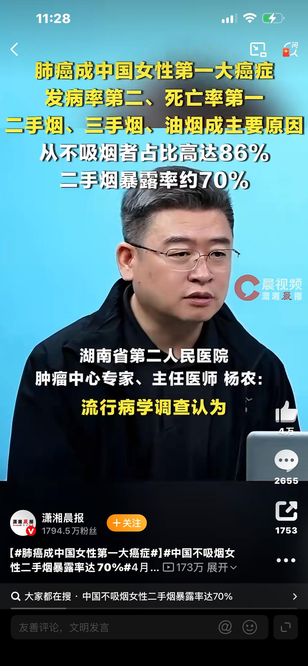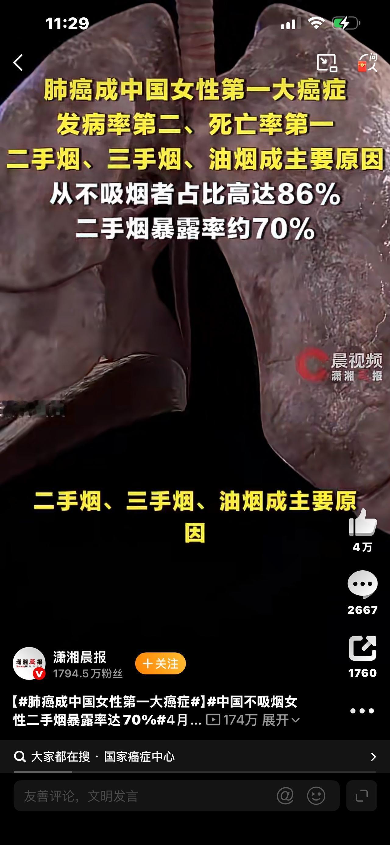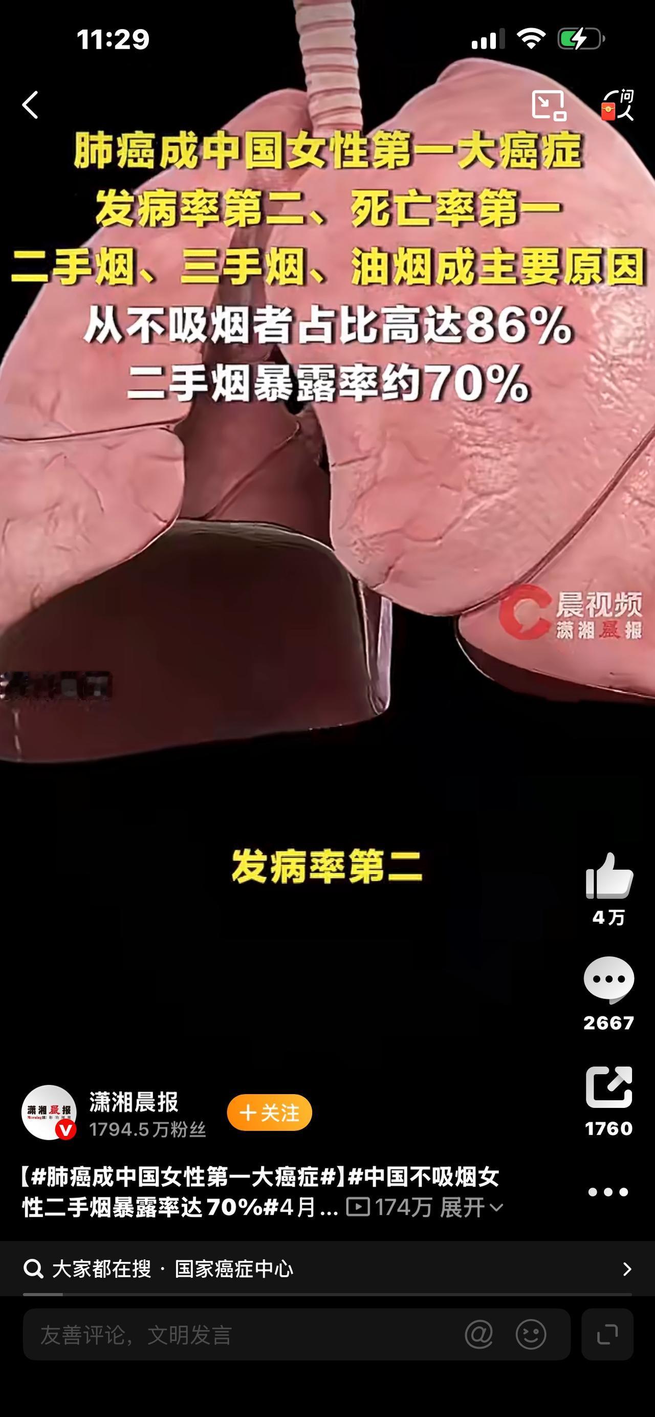 警惕!肺癌已成中国女性第一大癌!97%患者不吸烟,凶手就在你家! 警钟敲响!国家癌症中心最新数据炸锅: 肺癌已超越乳腺癌,成为中国女性第一大癌症! 更扎心的是: 确诊的女性患者里,97.5%都不吸烟! 不抽烟、爱干净、天天做饭的好女人, 为什么偏偏被肺癌盯上? 厨房油烟、二手烟、家里那股看不见的毒气, 正在悄悄吞噬千万女性的肺! 今天的内容,每个女人、每个家庭都必须看! 一、数据惊心:女性肺癌正在年轻化 过去16年,肺癌患者男女比例从7:3逆转为4:6! 45岁以下年轻女性患者,比例从3.4%暴增至19.2%! 她们大多不抽烟、不喝酒、生活规律, 却在体检时突然查出肺结节、甚至肺癌晚期。 不吸烟≠安全,这张“安全牌”早就失效了! 二、三大“隐形杀手”,天天在害你 1. 二手烟/三手烟:家中致命毒雾 中国70%不吸烟女性,长期活在二手烟里! 丈夫抽烟、家人抽烟、办公室抽烟, 烟雾里69种致癌物,在空气飘5小时不散。 长期吸入,肺癌风险直接升高24%! 更毒的是三手烟: 残留在沙发、衣服、头发上的毒素, 能持续危害几周,天天被你吸入肺里! 2. 厨房油烟:妈妈们的“慢性毒药” 中国式煎炒烹炸,油烟里含苯并芘等强致癌物。 研究显示: 每天做饭超2次,风险是常人3倍; 不开抽油烟机,风险再翻番! 你以为是饭菜香,其实是肺部在慢性中毒! 无数家庭主妇,没输在生活压力, 却输在了天天为家人做饭的油烟里! 3. 基因敏感+空气污染:双重暴击 女性天生对致癌物更敏感, 同样毒素,女性更容易DNA损伤。 加上雾霾、装修污染、汽车尾气, 三重打击下,肺根本扛不住! 三、转折觉醒:别等生病了,才懂得心疼自己 很多女人一辈子都在为别人活: 操心老公、照顾孩子、打理全家, 唯独忘了心疼自己。 你以为的勤俭持家: 舍不得开油烟机、不敢拒绝二手烟、 舍不得花钱体检、不舒服硬扛着—— 这些“节俭”,最后都变成了癌细胞! 更可怕的是: 肺癌早期无症状,一发现就是中晚期! 5年生存率不足20%! 多少家庭,因为一张诊断书,瞬间崩塌! 女人这一辈子, 从女儿、到妻子、到妈妈, 一路付出、一路坚强, 却常常忘了: 你的健康,才是全家的天! 肺癌不可怕, 可怕的是明明能预防,却被忽视; 明明能早查,却被拖延。 从今天起: 远离二手烟,厨房必开油烟机, 雾霾天戴口罩,40岁后每年做CT。 好好爱自己, 不是自私,是对全家最大的负责! 愿每一位女性: 远离癌魔,呼吸自由, 被世界温柔以待,健康平安一生! 你家有人抽烟吗?做饭开油烟机吗? 为了自己和家人健康,转发提醒!肺癌治疗避坑 肺结节型肺癌 预防治疗肺癌 肺癌体检