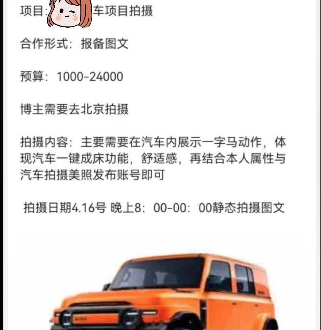 车媒也太卷了,拍摄要求会一字马动作,能体现车子一键成床的功能。看来我司得招一个能出镜、还要会倒挂,会一字马的小姐姐了?