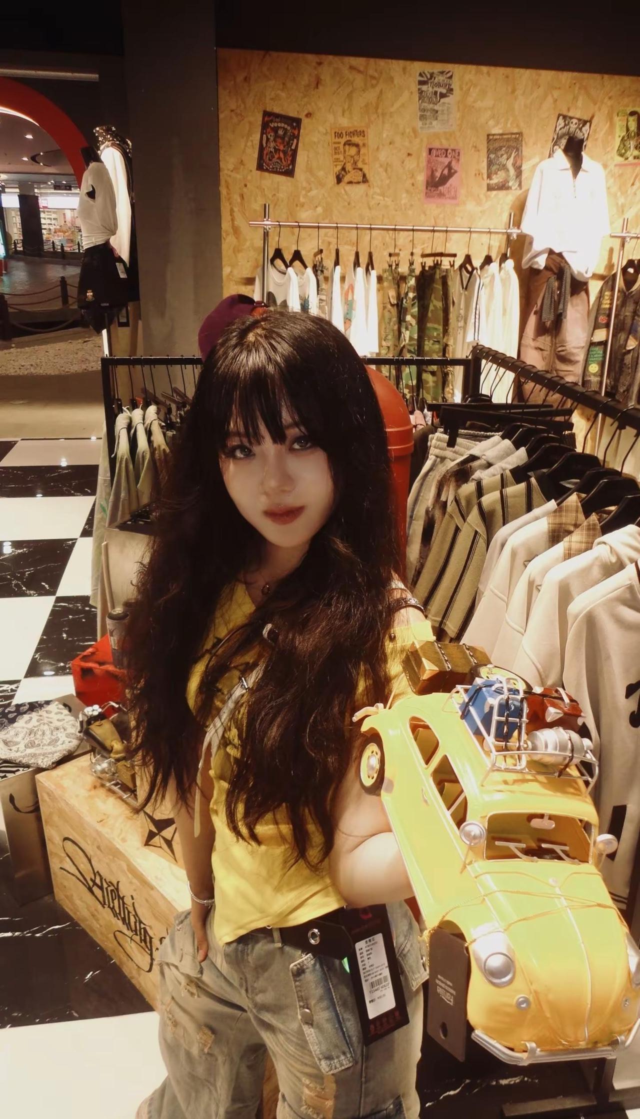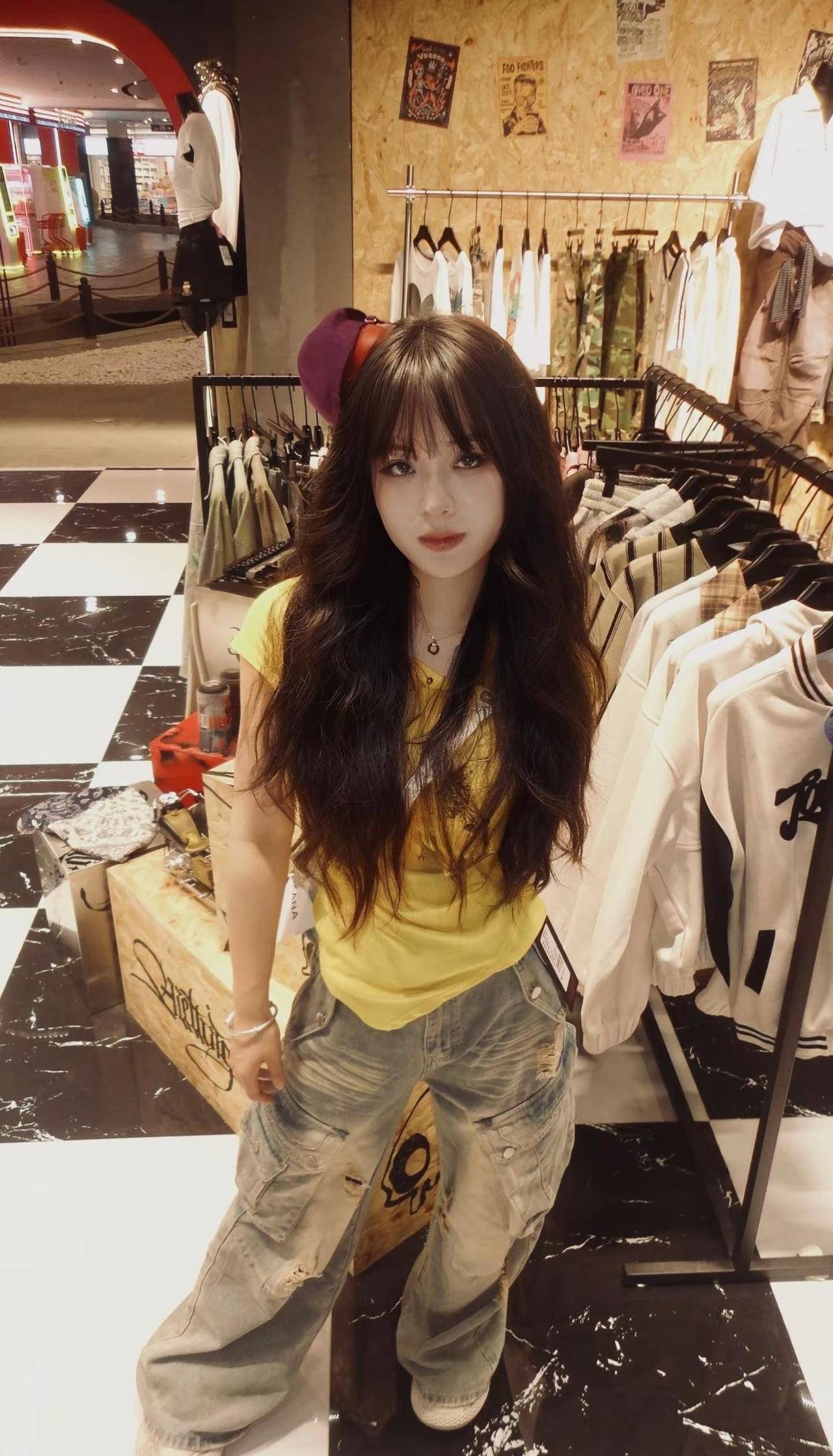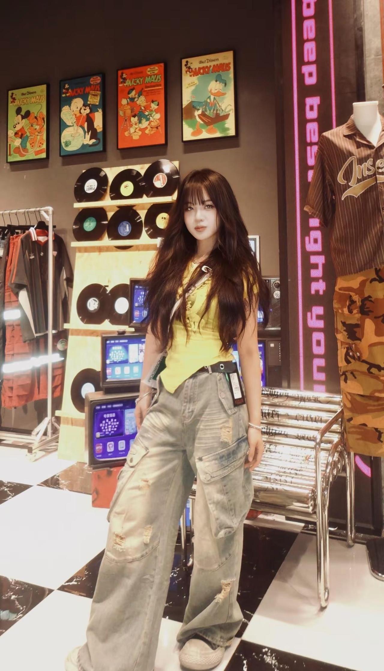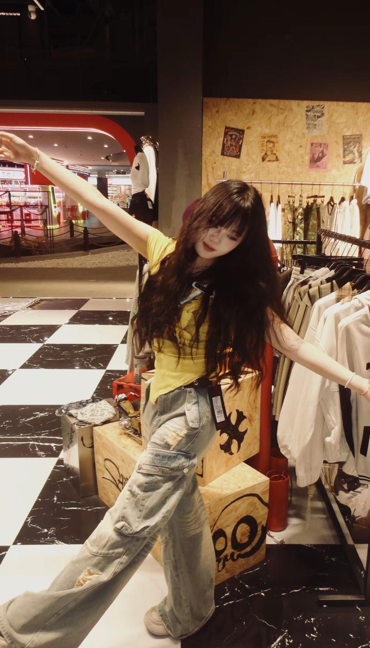 黄色上衣搭配牛仔裤 西双版纳爱琴海购物中心KANA