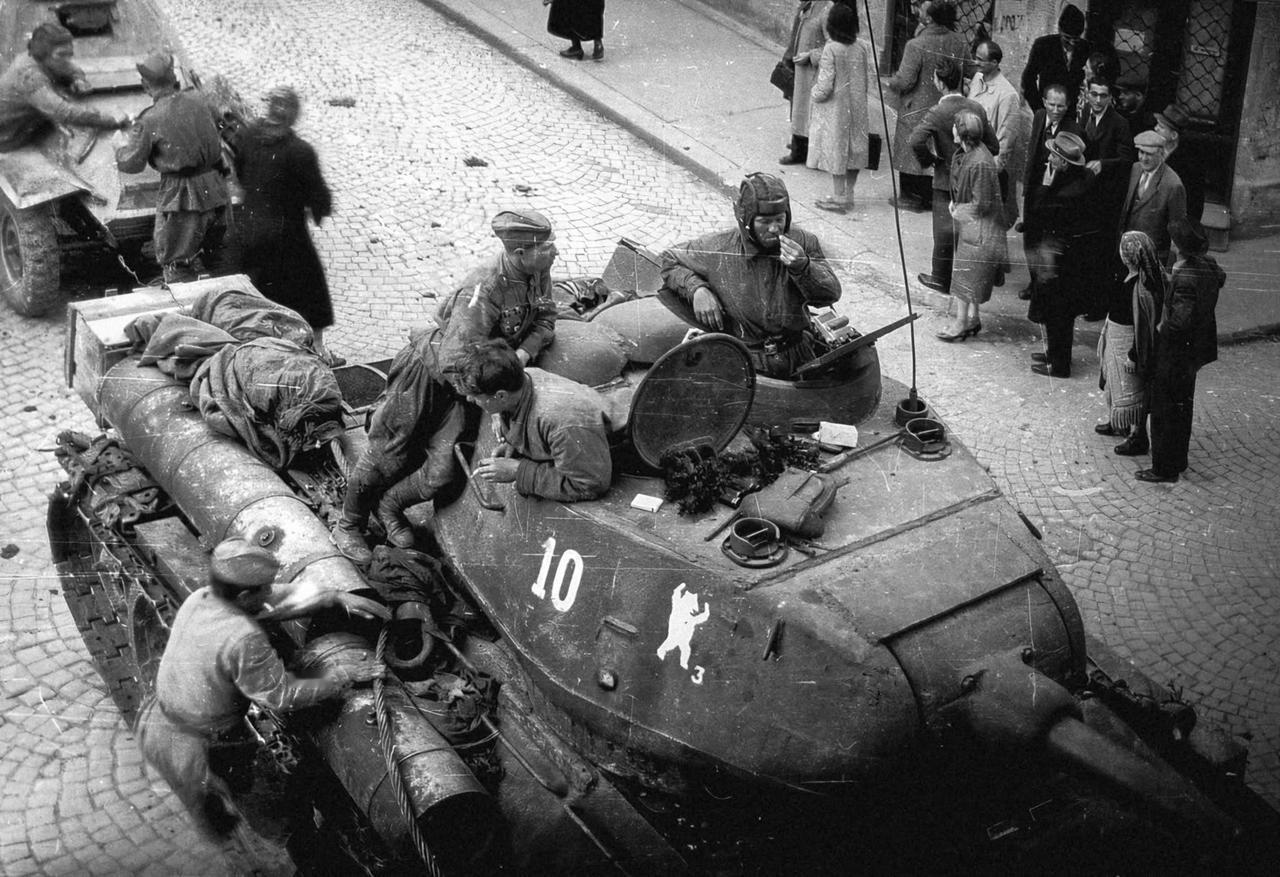 1944年10月下旬,南斯拉夫首都贝尔格莱德,苏军第4近卫机械化军第36近卫坦克旅的T-34-85坦克正在市区行进中!南斯拉夫战役 二战苏联战车 苏t34 老照片 二战