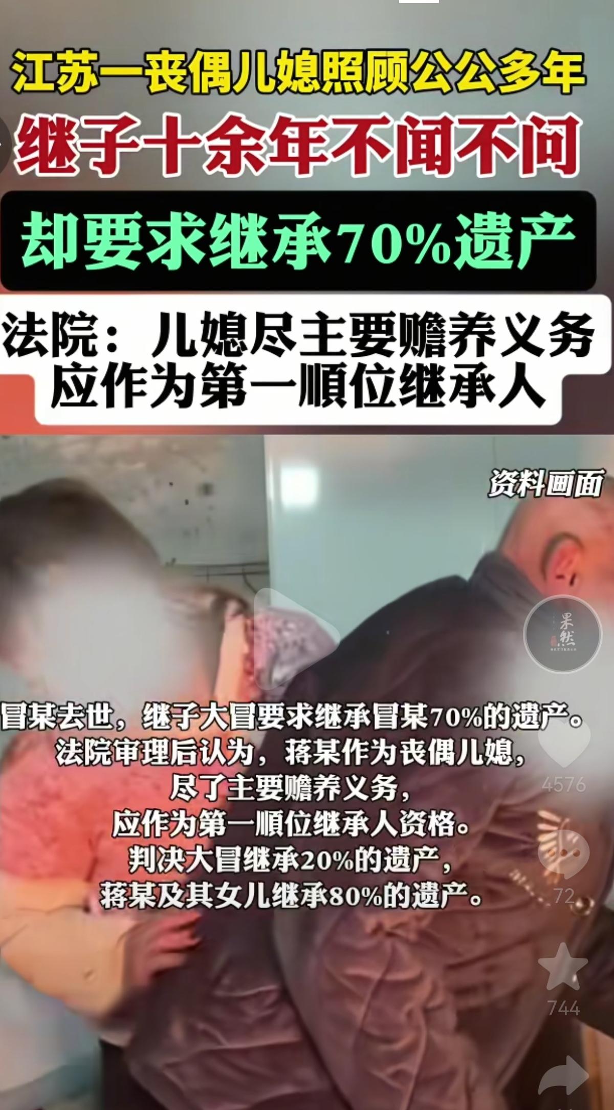 江苏的冒大爷和妻子属于再婚家庭,妻子带着和前夫生的儿子大冒,两人又生了个儿子小冒,组成了四口之家。 后来夫妻俩感情不和分居,冒大爷跟着亲生儿子小冒生活,妻子则跟着大冒过。 2014年,小冒意外去世,儿媳蒋某没改嫁,看着没人照顾的公公,她二话不说接了过来,这一照顾,就是整整8年。买吃买穿、看病陪护,大事小情全是她一个人扛,连冒大爷的后事,也都是她一手操办的。 而另一边,继子大冒对冒大爷几乎不闻不问,十多年里连面都很少露。可等冒大爷去世后,大冒却突然跳出来,狮子大开口要继承70%的遗产。 法庭上,蒋某拿出了这些年照顾公公的各种证据,法院最终认定:丧偶儿媳蒋某尽了主要赡养义务,应作为第一顺位继承人,判决蒋某和女儿继承80%遗产,大冒只拿到20%。 网友看到后评论说:“大冒脸不疼吗?十多年不管不问,分遗产倒是跑得比谁都快!” 也有的网友说:“这判决太公正了!赡养的功劳,比血缘亲多了!” 还有的网友说: “蒋姐这8年没白熬,法律终于给了她一个交代!” 更有网友表示:“这种继子就是典型的白眼狼,只认钱不认人!” 说真的,看完这个判决,我心里特别舒服。蒋某不是冒大爷的亲女儿,却在丈夫走后,用8年的陪伴和照顾,撑起了老人的晚年。 而继子大冒,占着血缘关系,却连最基本的赡养义务都没做到,还好意思抢大头遗产? 法律这次真的没和稀泥,它给了“赡养”应有的尊重,也狠狠打了那些“只认钱不认人”的白眼狼一巴掌。 赡养不是嘴上说说,是实打实的付出,谁在老人身边尽孝,谁就该得到应有的回报。 最后,我想说:人心换人心,孝心换公道,付出永远不会被辜负。 对此,你有什么看法呢?