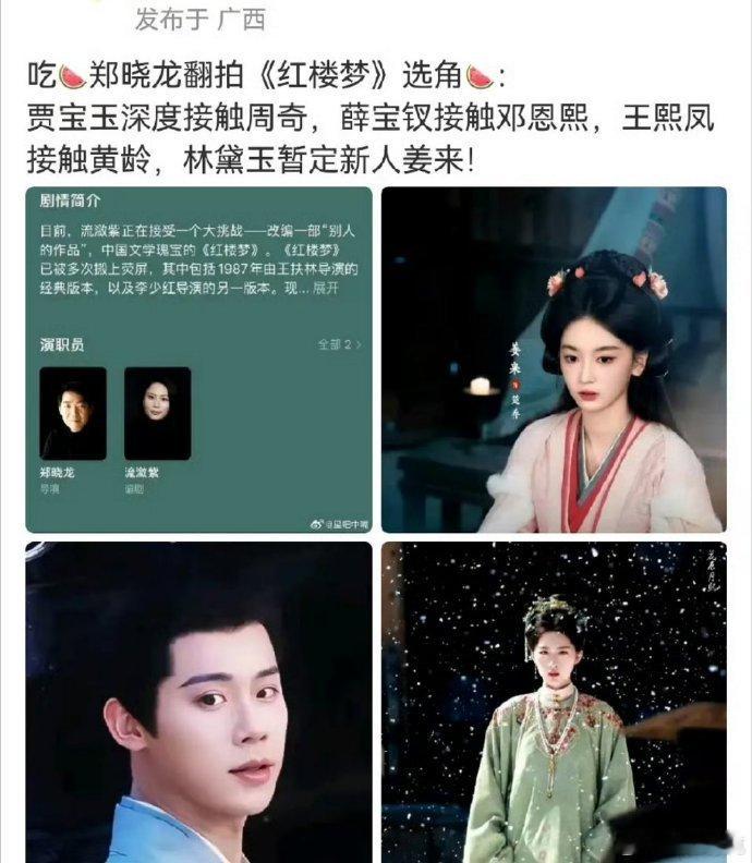 曝红楼梦翻拍选角郑晓龙翻拍红楼梦 郑晓龙翻拍《红楼梦》选角瓜,贾宝玉深度接触周奇薛宝钗接触邓恩熙,王熙凤接触黄龄,林黛玉暂定新人姜来