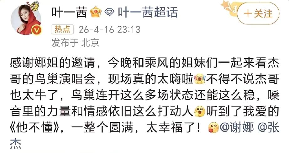 友情满分!叶一茜现身张杰鸟巢演唱会,发文感谢谢娜邀请 4月16日,叶一茜惊喜现身张杰北京鸟巢演唱会,现场氛围超嗨,她还在社交平台晒出现场美照,引发网友热议。 她不仅沉浸式听歌,如愿听到心爱歌曲,还和浪姐众姐妹、谢娜、杜海涛同框拍大合照,画面温馨满满。 随后叶一茜特意发文并艾特谢娜、张杰,暖心感谢娜姐的邀请,直言现场氛围超嗨,幸福感爆棚,一众好友齐聚,神仙友情太让人羡慕! 免责声明:文章描述过程、图片都来源于网络,此文章旨在倡导社会正能量,无低俗等不良引导。如涉及版权或者人物侵权问题,请及时联系我们,我们将第一时间删除内容!如有事件存疑部分,联系后即刻删除或作出更改。 张杰演唱会拍照 叶一茜红毯照
