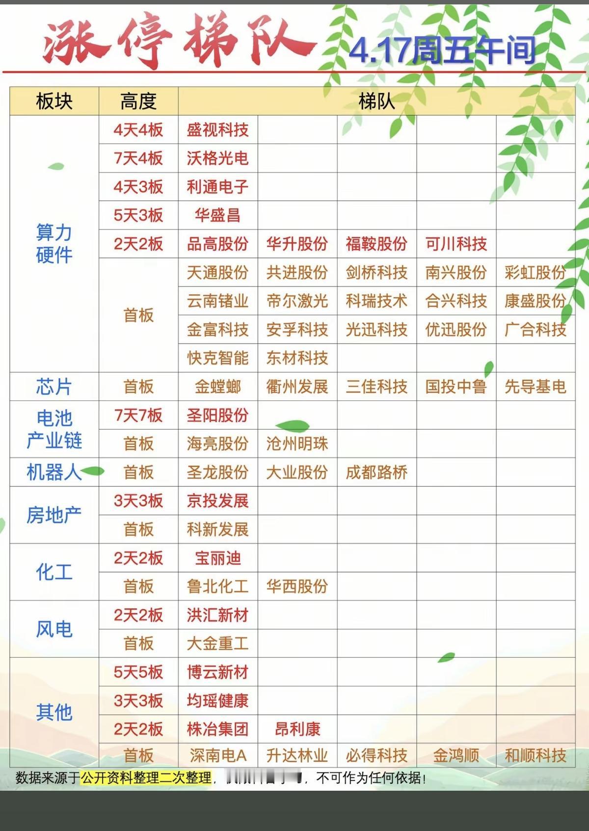 4.17周五 涨停板股票:梯队+高度! 算力硬件 25股涨停 芯片 5股涨停 电池产业链 3股涨停 机器人 3股涨停 房地产 2股涨停
