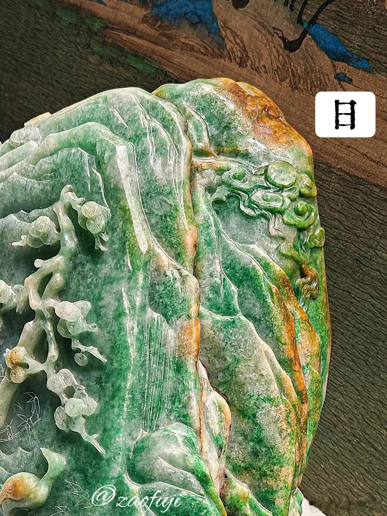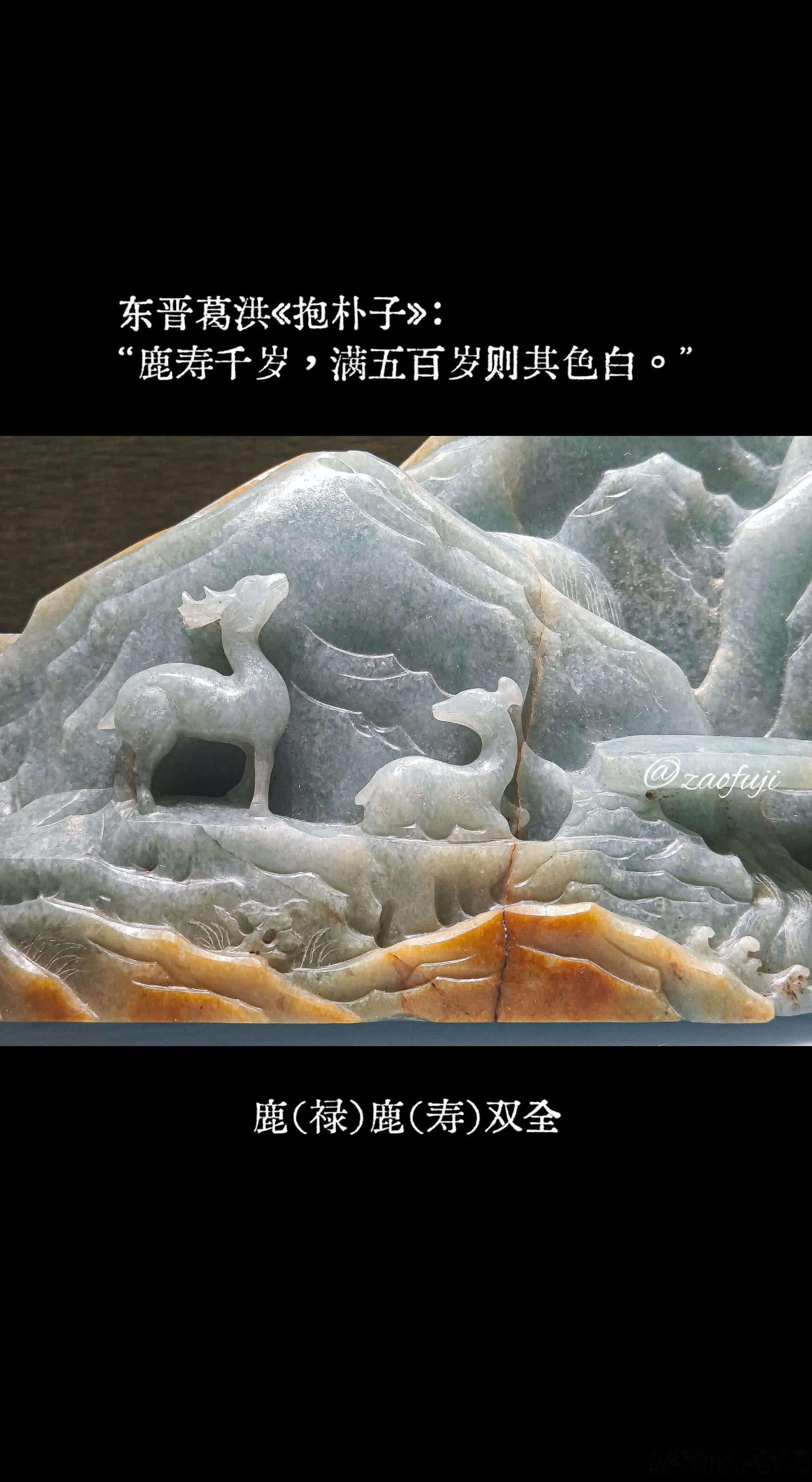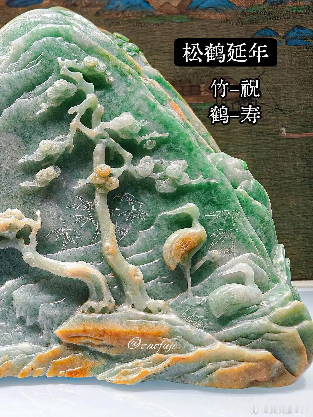故宫博物院藏【清中期•翠雕鹿鹤同春图山子】,清代中期宫廷陈设品,国家一级文物,作品为山形,以整块翡翠雕琢而成,高29.5厘米,长57.8厘米,厚19.5厘米。原料具有天然绺裂、石纹及赭红色皮色特征,完整呈现了乾隆时期宫廷玉作"巧做"玉雕技法,展现出清中期宫廷玉匠处理瑕疵原料、皮色保留的高超技艺。 【山子】山子是一种以山石为主体的立体景观,主要流行于明、清,以竹、木、牙、石、玉等材质制成,宋代的作品目前发现的很少。玉山子在清代宫廷又被称作「玉图画」。制作玉山子大都先有画稿,然后再行琢制。这类作品讲究布局、意境、造型、工艺,有很高的艺术价值。 【图案寓意】主体纹饰由多组意象构成复合寓意体系:❶鹿鹤同春,禄寿双全鹤鹿同春,常用于祝寿之辞,寓意长寿福禄。双鹿(禄+寿),呈立卧互动状,象征「禄寿双全」。鹤、鹿均为古代瑞兽。仙鹤,是长寿、高洁的象征。唐代诗人王建《闲说》诗云:“鹤寿千年也未神”。鹿,自古被视为长寿仙兽,有“鹿寿千岁”“鹿寿千年”等说法。同时,鹿谐音“禄”,象征福禄。❷六合同春鹿鹤谐音“六合”,构成“六合同春”的吉祥寓意,寄托天下皆春、万物繁荣的愿景。❸日月同辉高峰两侧以云托日、月,象征"日月同辉。通过昼夜意象并置形成"日月同辉"时空概念,隐喻王朝统治的永恒性与天地秩序。❹松鹤延年松树四季常青、生命力顽强,古人常用“寿比南山不老松”等祝寿语表达对长寿的祈愿。❺背景点缀竹丛象征君子品格,竹=祝❻山间溪桥暗含"通达"之意❼枫树与瀑布的组合强化秋景意境 【简介】翠料局部呈青绿色,个别处翠色较深,用山料翠玉雕成,表面有染色。作品运用浮雕与巧雕工艺。正面雕刻白云、泉水、溪桥,两岸分别布置双鹤立卧于古松竹丛旁,双鹿呈立卧姿态,合称"鹤鹿同春";高峰两侧以云托日、月象征"日月同辉"。背面保留皮色雕刻枫树、塔松、瀑布等景观,并利用赭红皮色营造霞光效果,绿色分布差异表现层峦叠嶂。作品对材料未做太多的剔除,设计中有保存材料之用意。 【工艺亮点】该山子采用整块翡翠原料雕刻,在保留天然赭红色皮色的基础上,运用多层次浮雕技法塑造山形主体。❶雕刻者利用翡翠原料的色泽分布差异:绿色较浓处雕刻松针、竹叶等植被细节;浅色区域表现云气、山石肌理;赭红色皮色被设计为霞光背景与枫叶元素。❷正反两面构图形成对比:正面以动态的鹤鹿组合为主景,背面通过静态的瀑布、塔松营造深远空间感。❸对原料的瑕疵工艺处理,展现出清代宫廷玉匠处理瑕疵原料的高超技艺:雕刻过程中巧妙规避了原料存在的天然绺裂,工匠将最大绺裂置于山体背光面,通过加深阴刻线弱化裂隙可视度;将石纹走向与山势雕刻方向保持一致,转化为山体自然纹理。 【原料特征】这件作品所用翡翠具有典型清代中期原料特征:❶晶体颗粒均匀,质地达到糯冰种级别;❷绿色呈斑块状分布,色浓度随雕刻深度变化;❸存在天然生成的横向石纹与斜向绺裂;❹表面保留2.8厘米厚的原生赭红色风化皮;❺局部可见雾状棉絮结构,增强山体云雾的质感表现。 【收藏与历史价值】作为清宫旧藏陈设器,该山子承载多重价值:❶工艺史价值:完整呈现乾隆时期"巧做"玉雕技法,尤其是皮色保留与瑕疵处理技术达到历史高峰。❷艺术价值:构图突破平面局限,通过多视点雕刻实现三维空间的诗意表达。❸文化价值:纹饰系统融合汉文化吉祥主题与满族山野审美趣味,反映清代多元文化交融特征。❹现藏于故宫博物院,被列为国家一级文物。其保存状态良好,除底部有清代红木座接触痕迹外,主体未见明显磨损或修复痕迹。历史