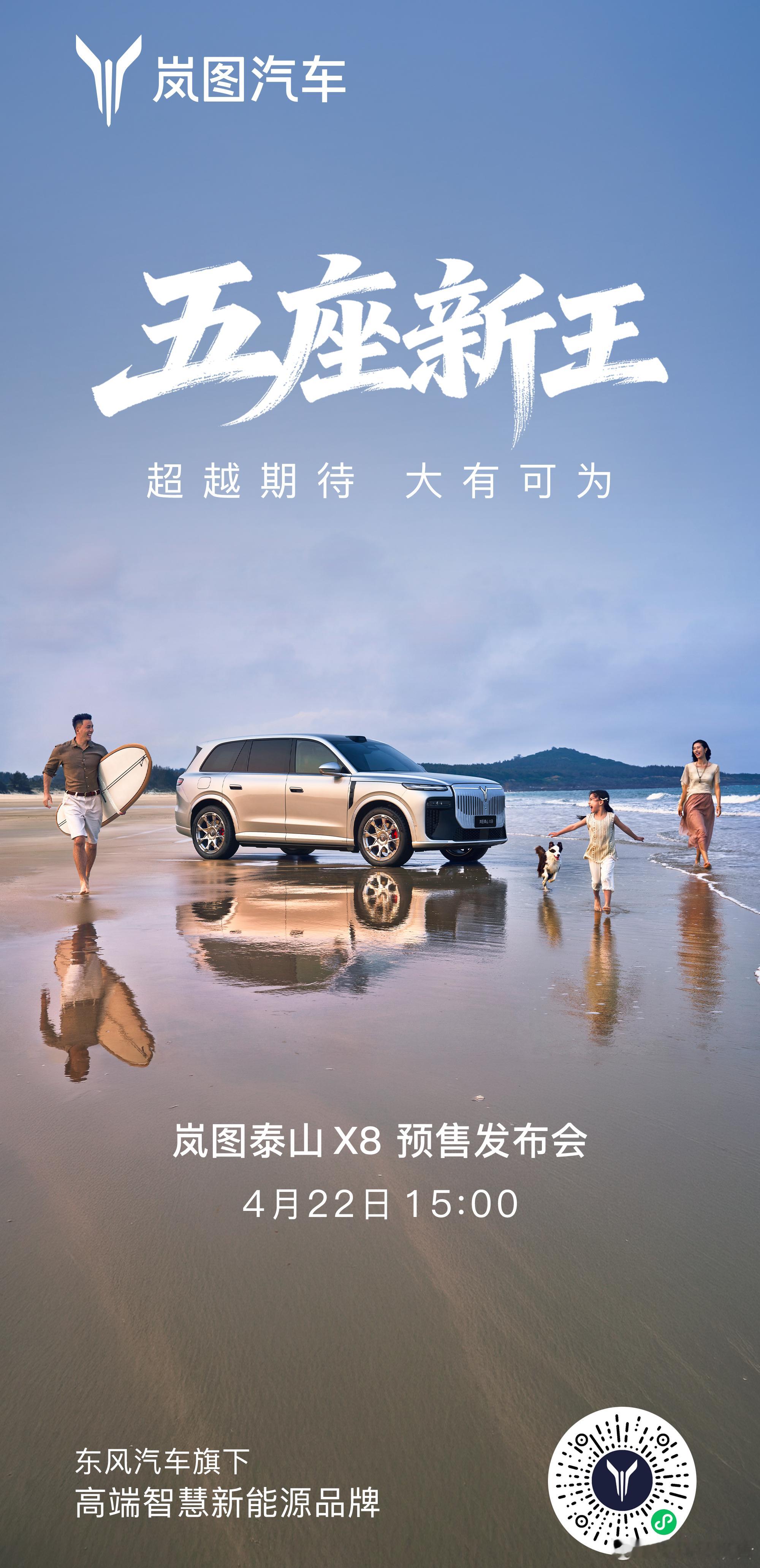 岚图泰山X8 即将开启预售,定位庭院级大五座SUV。车长5.2米,座舱6.1平米,配华为四激光雷达、零重力座椅及800V快充,提供纯电/插混双版本。岚图泰山x8岚图汽车新能源汽车