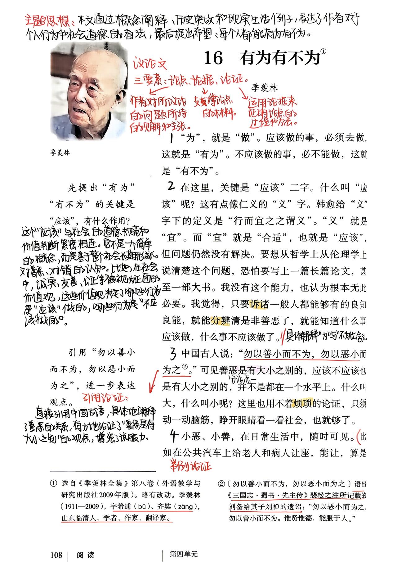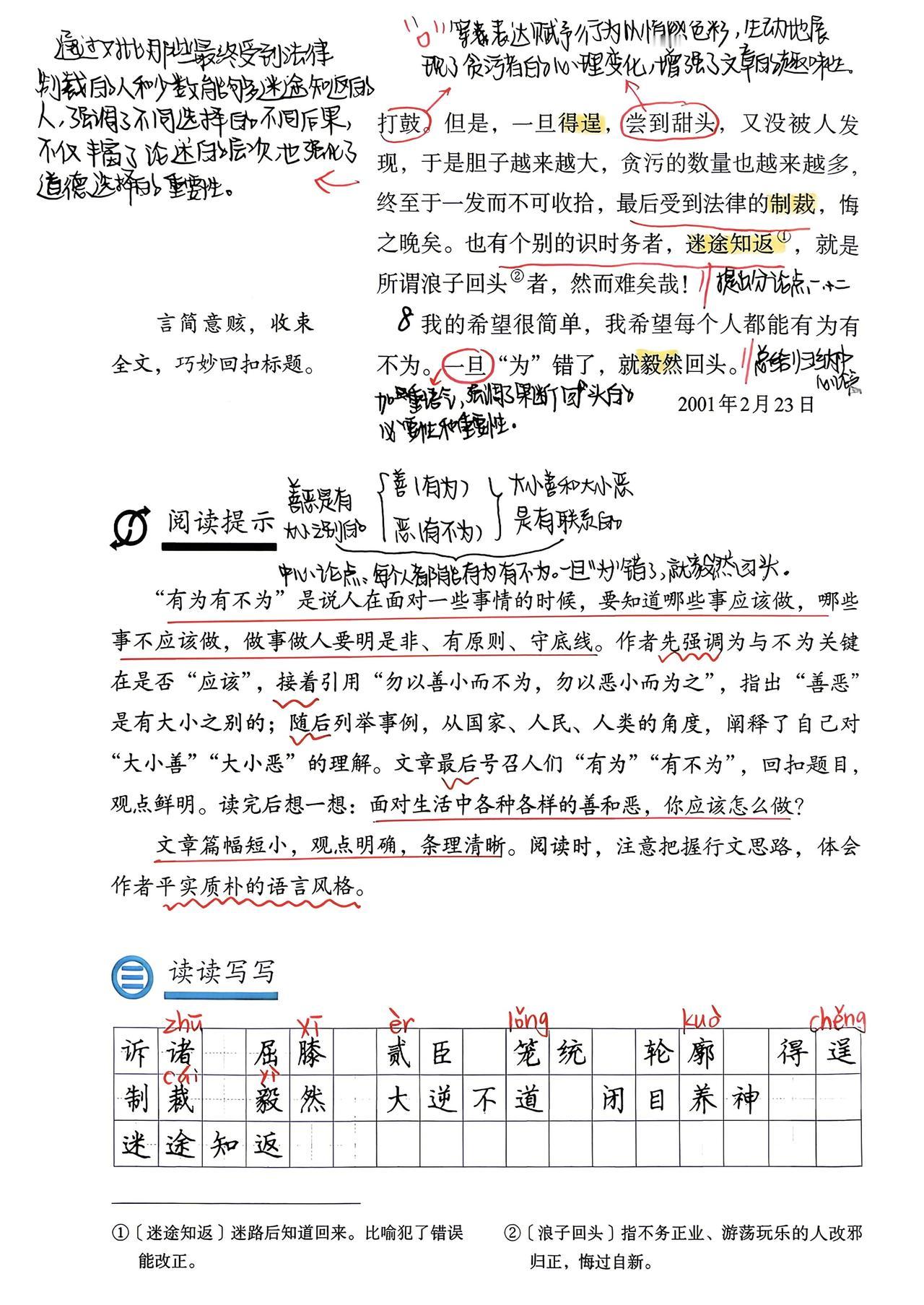 七年级下册语文,第16课《有为有不为》课堂学习笔记,收藏预习复习~七年级语文
