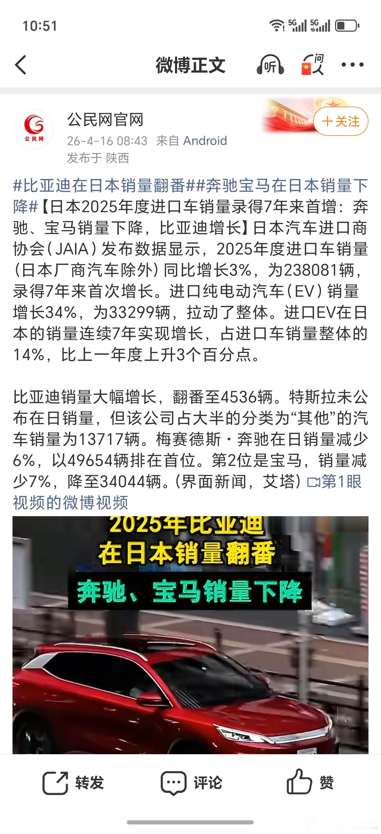日本是本土封闭市场,根深蒂固,冥顽不灵,国外车很难打入,市场销量前10名均是日本车企。上一届总共有三家外国车企参加东京车展,除了比亚迪,就是奔驰与宝马。比亚迪勇气可嘉...大巴车深耕日本多年。比亚迪在日本市场推个K-CAR,算当地定制。另有各种电动小卡车,去年3870辆几乎就是中国车全部数字。去年事件发酵,日系车在中国未见进一步下滑,而本就不多的比亚迪在日本去年8月802辆开始,下滑严重(整年3870辆,几乎是中国车全部数字)。近期其补贴参差不齐,不说日本车企,其它进口特斯拉,奥迪,现代,奔驰电车皆获大额补贴,新能源王者比亚迪在日本的额度最低,明眼人都看出高市政府针对中国企业。