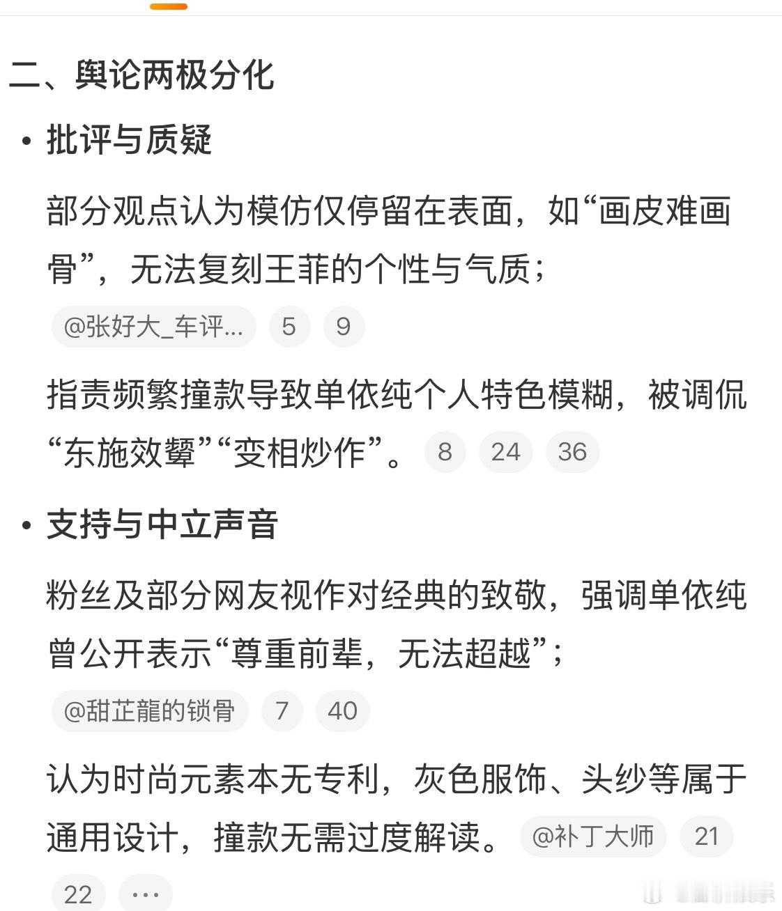 单依纯王菲 撞造型其实问题不在单依纯一个人身上,现在整个乐坛新人都在吃老前辈的红利,从造型到唱法都在复制。什么时候才能有个真正“新”的人出来啊。