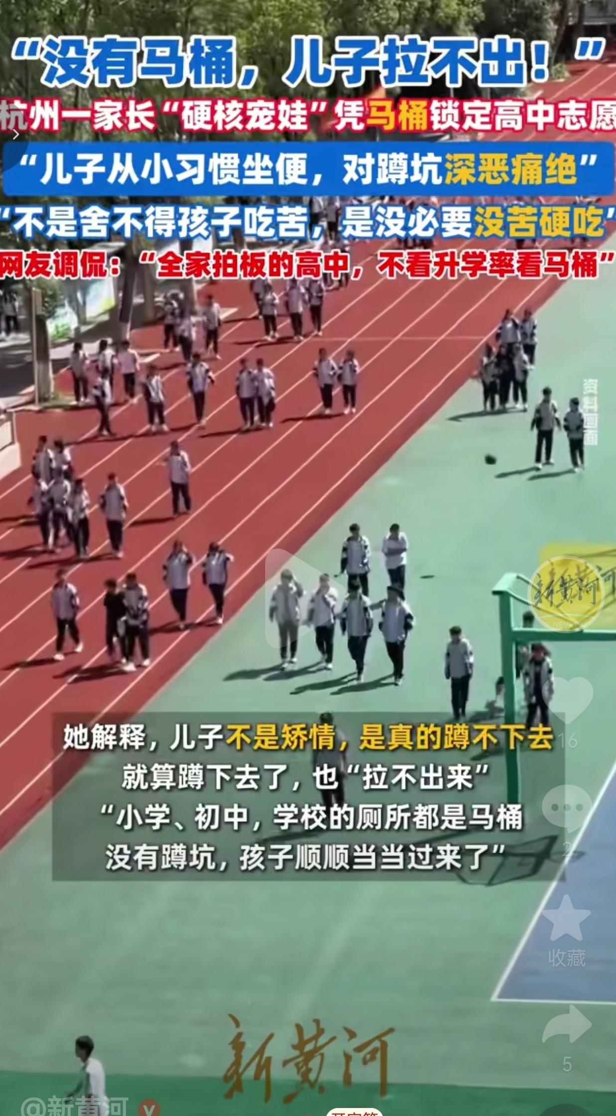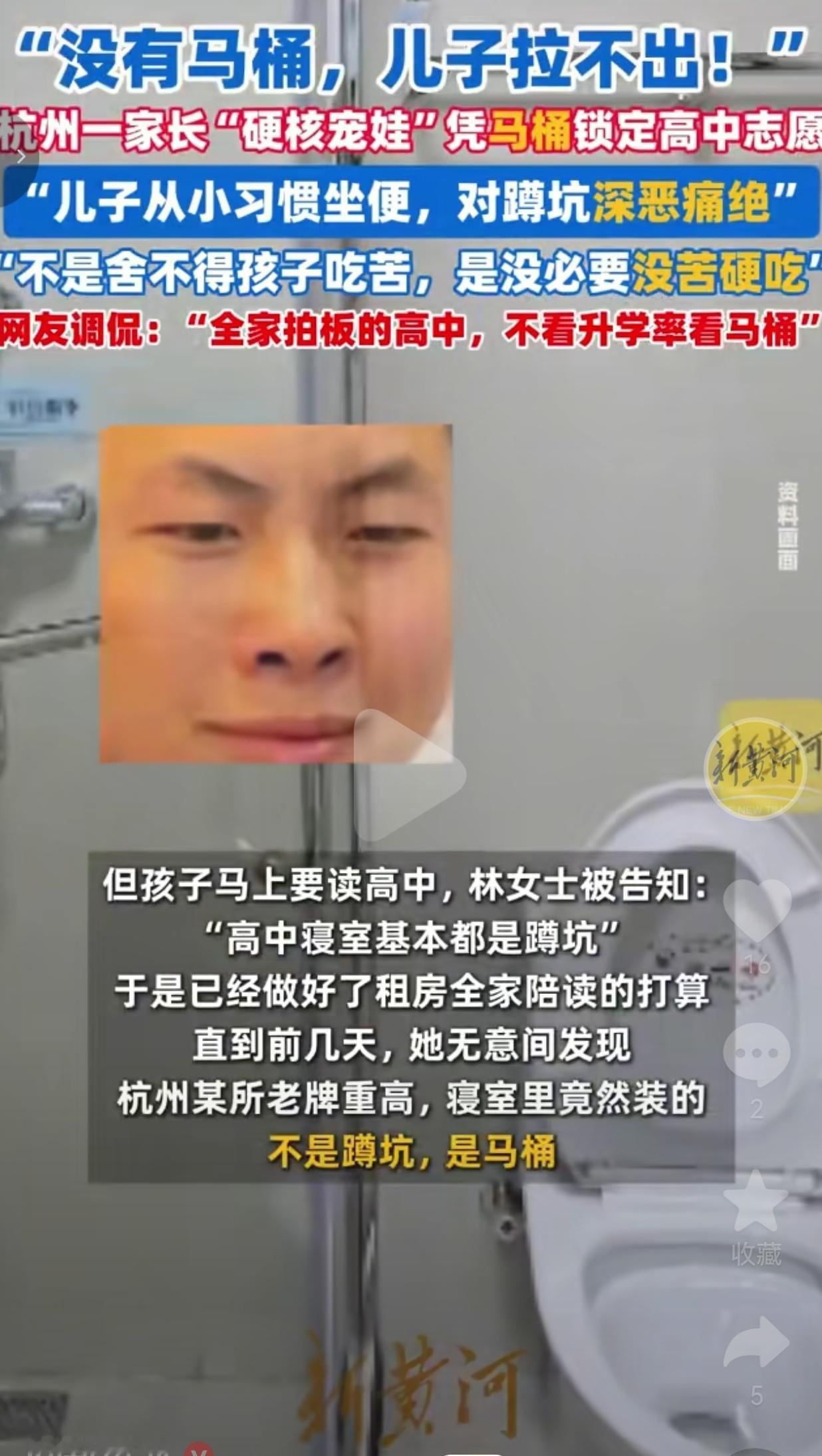 这年头选高中,居然得先看厕所装的是啥!杭州这位初三妈妈,为了给儿子填志愿,把马桶都当成了硬指标。 她儿子从小用坐便长大,小学初中也都是马桶,蹲坑根本用不惯,一蹲就拉不出来,便秘到影响学习那种。 本来都打算好了,大不了全家租房陪读,结果居然发现浙大附中寝室里,厕所居然是马桶! 听说是学校前两年听学生意见,直接把蹲坑全换成坐便了,就怕孩子们闹肚子、便秘影响状态。妈妈当场就拍板了,志愿表就定这所了! 她说得也实在:不是舍不得孩子吃苦,是没必要在这种事儿上硬扛,遭罪又分心,犯不上。 网友看到后评论说:“救命!太懂了!我当年住校蹲坑,硬生生憋到便秘,一学期瘦了10斤!” 也有的网友说:“这哪是娇惯?明明是学校和家长都拎得清,身体舒服了才能学进去啊!” 还有的网友说:“以前总说‘吃得苦中苦’,结果现在才明白,没必要的苦真的纯纯没必要!” 更有网友表示:“学校这波操作太圈粉了!能听学生意见改马桶,比喊一万句口号都强!” 我真的特别理解这位妈妈。以前我们总觉得,上高中就得熬,住破宿舍、吃没必要的苦,才叫“磨砺意志”。 可现在才发现,真正的磨砺,从来都不是让孩子在如厕这种小事上焦虑内耗,而是让他们在舒服的环境里,把精力全用在学习上。 这不是溺爱,是终于有人明白:孩子的成长,不需要用刻意的苦难来证明。 与其逼他硬扛蹲坑,不如给他一个能安心学习的环境。 我们要磨的,是他面对难题的勇气,而不是让他在本可以更舒服的地方,硬吃没必要的委屈。 对此,你有什么看法呢?欢迎大家评论区讨论留言。