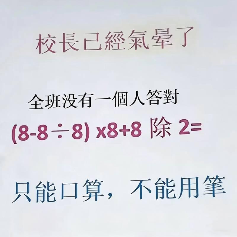 只能心算,不能用笔,能算对的人寥寥无几。 (8-8÷8)×8+8 除 2=?