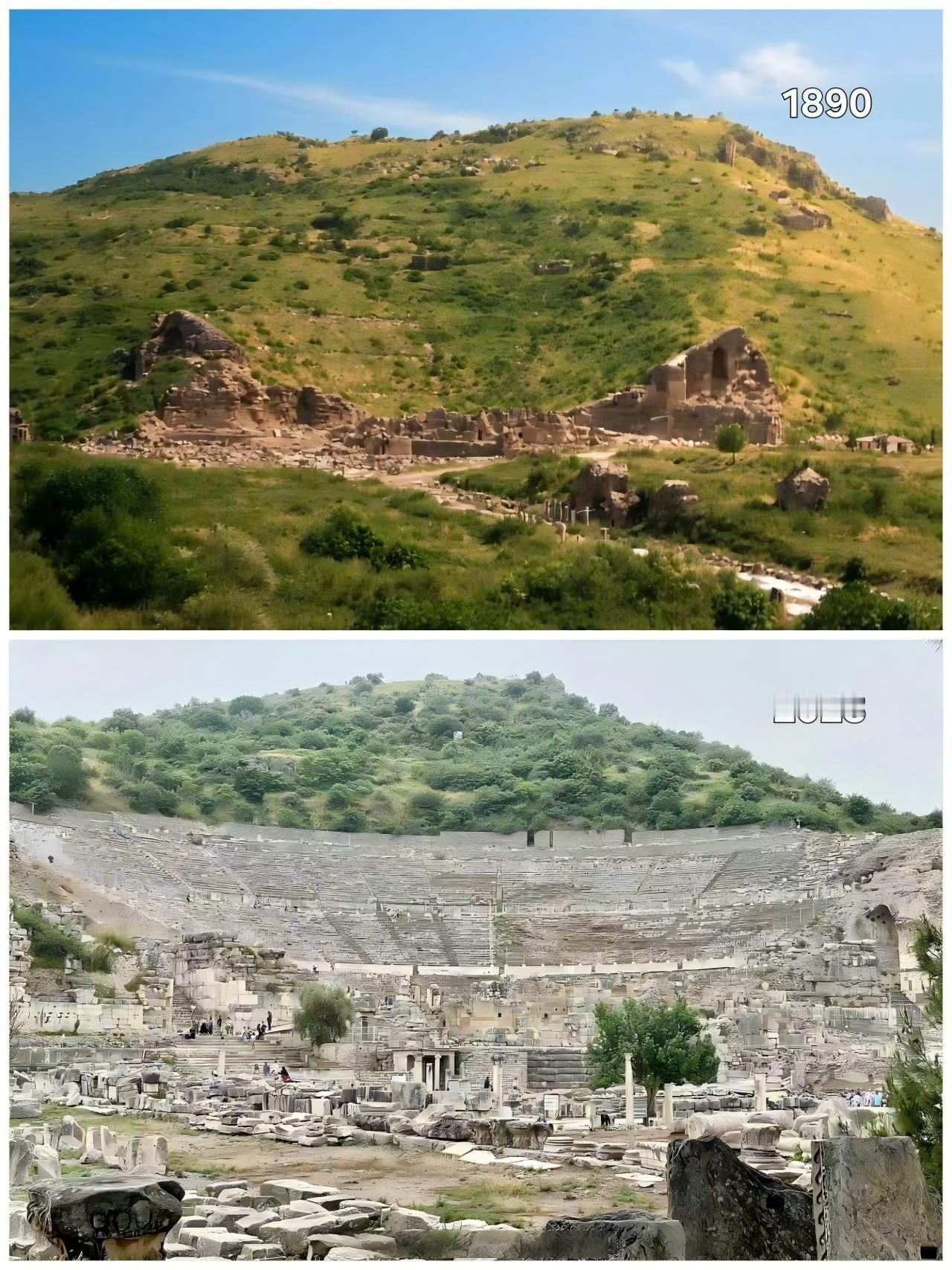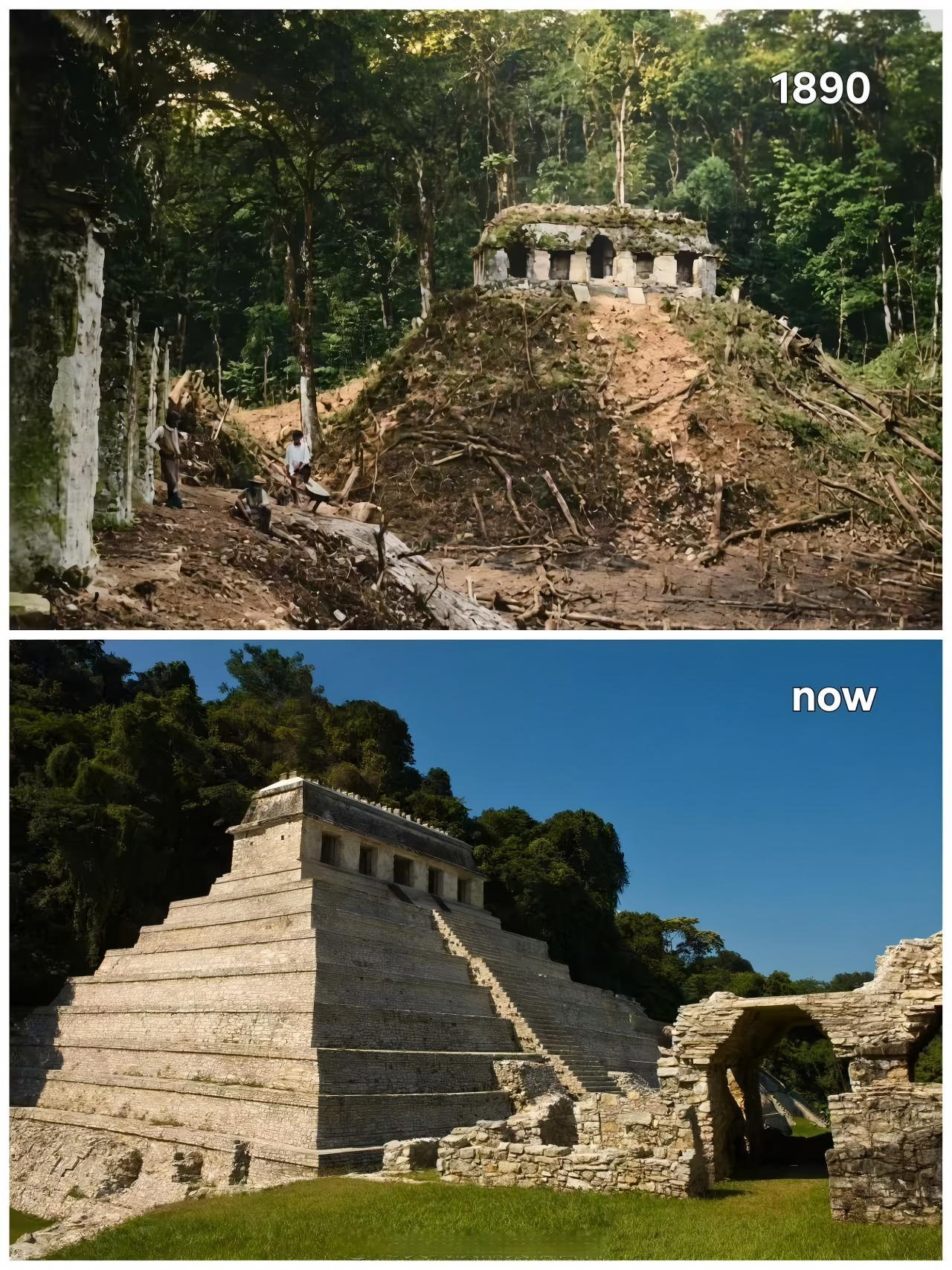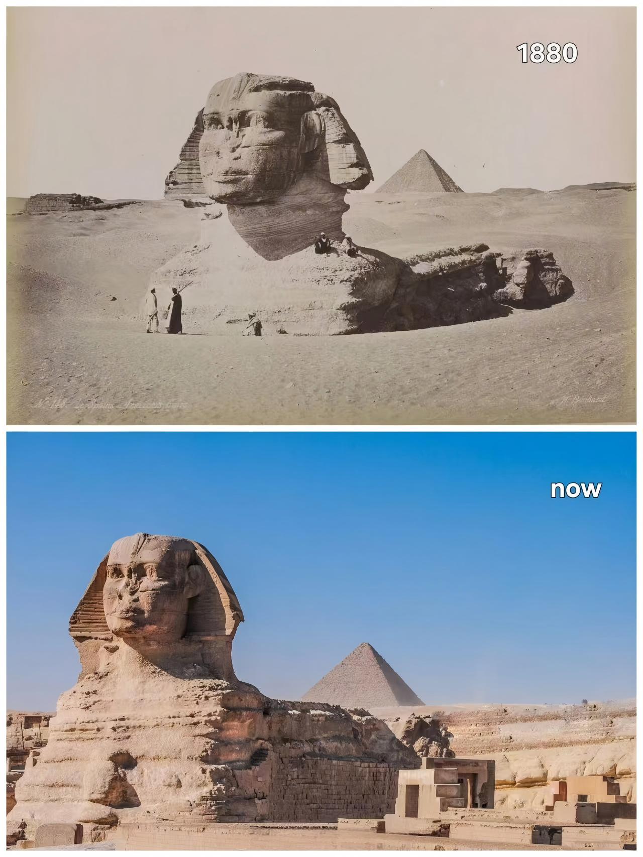 黄沙与荒草之下,原来藏着一整个文明的心跳。 这些跨越百年的对比图,像一把温柔的钥匙,打开了被时光掩埋的真相: 被黄沙半掩的狮身人面像,从 “只露一张脸” 到完整矗立; 被丛林吞噬的玛雅金字塔,从 “长满树木的土丘” 到展露神级建筑美学; 被岁月磨平轮廓的剧场,从 “普通山谷” 到重现千年前的辉煌回响。 考古学家们一铲一铲拂去尘埃,不是为了创造什么,而是为了让沉睡的文明,重新和这个世界打个招呼。