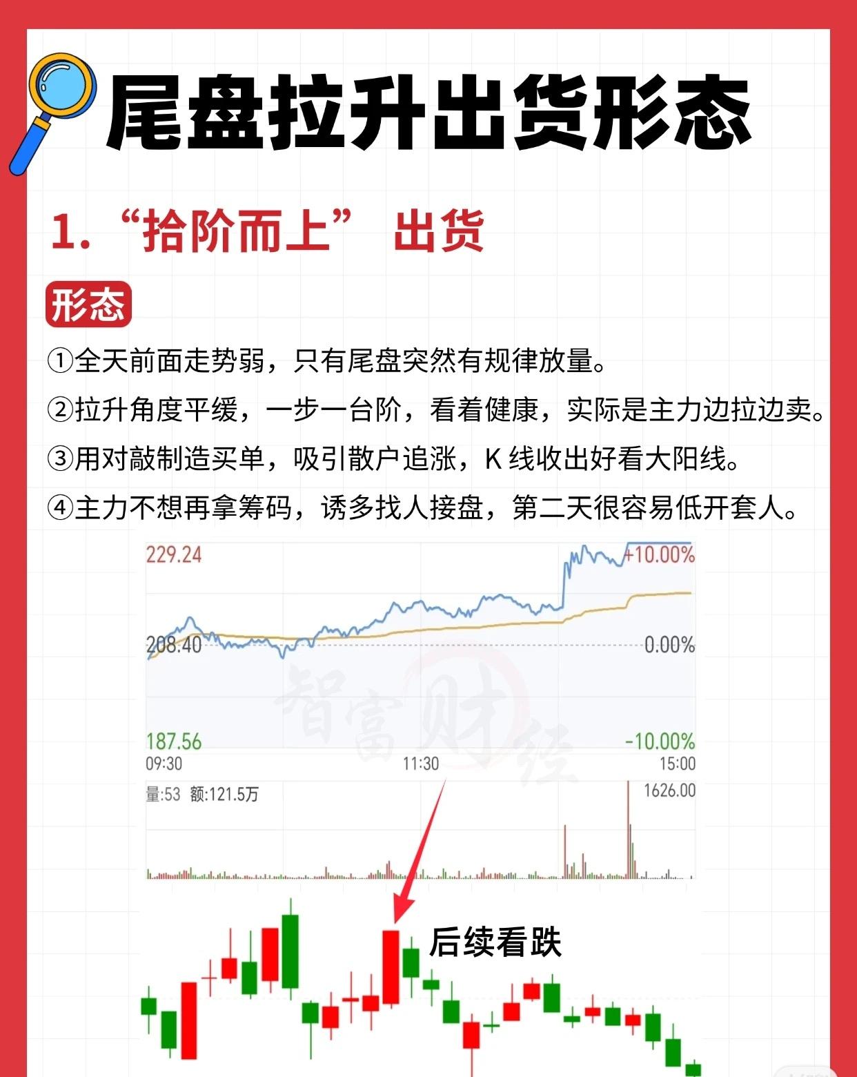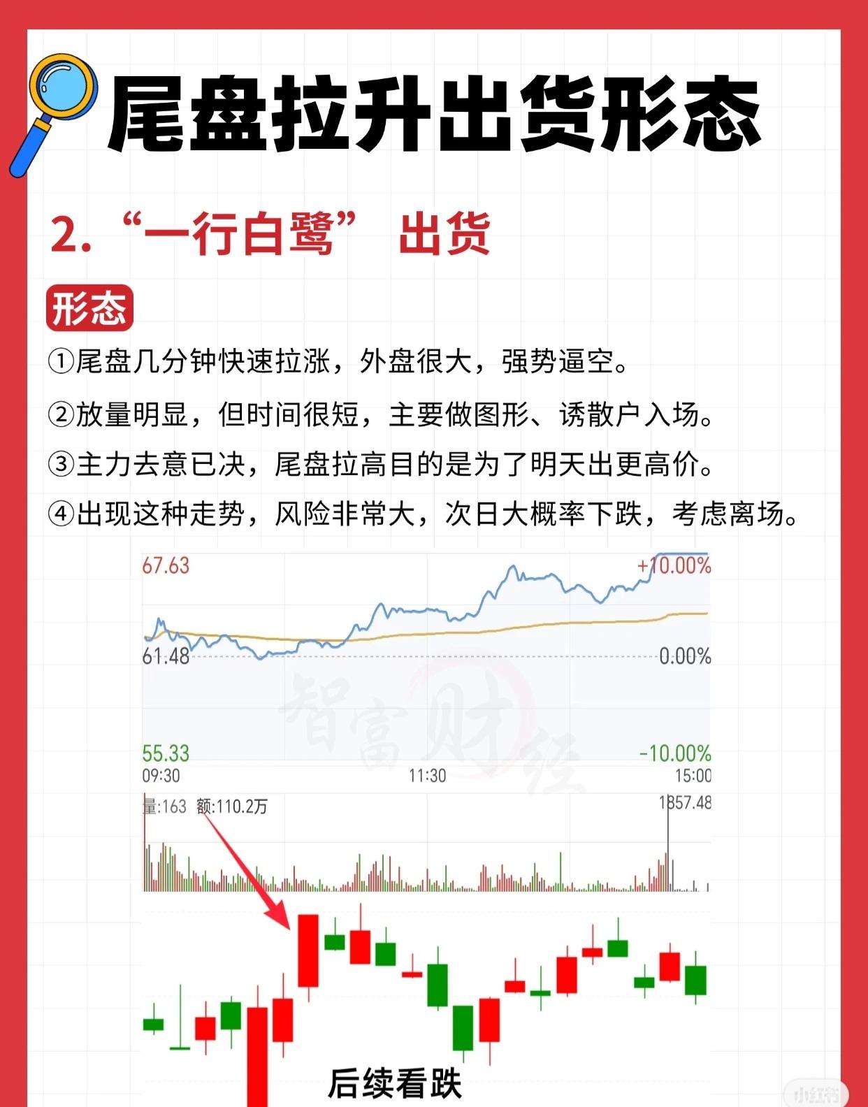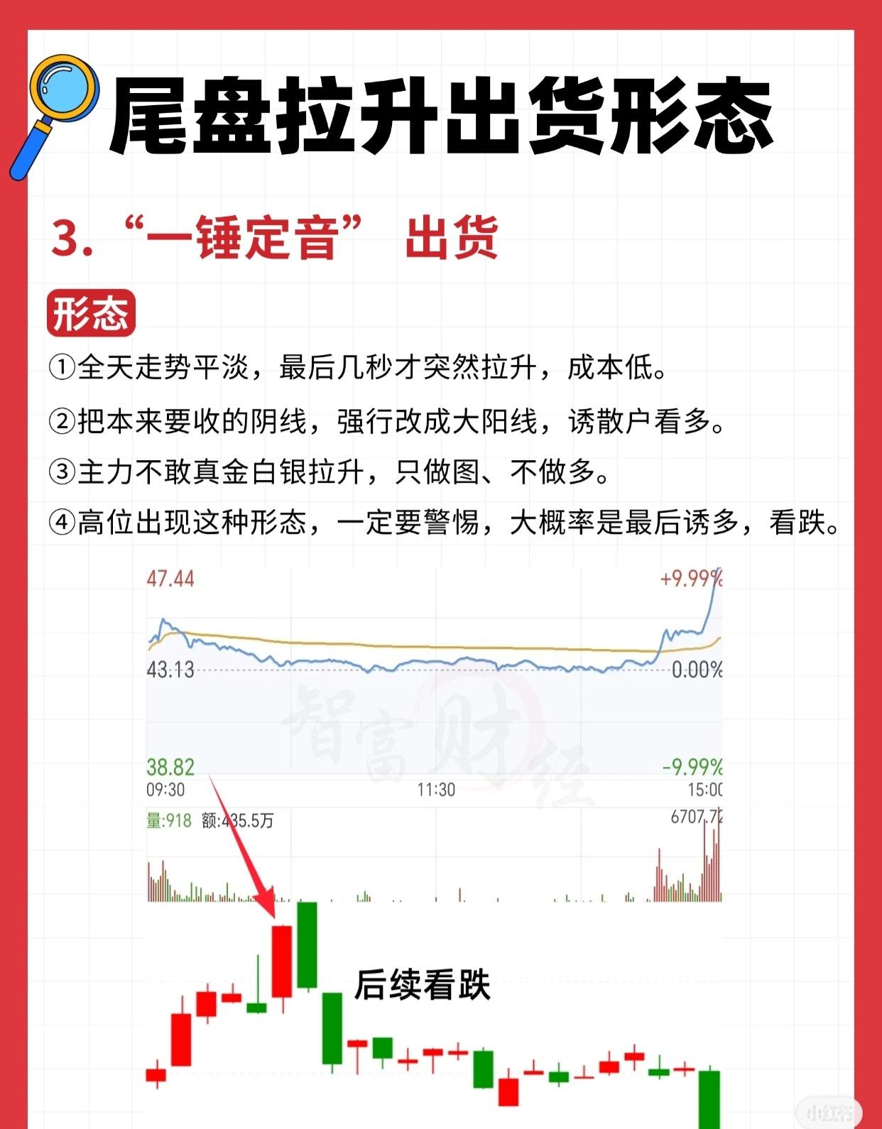 尾盘拉升出货形态解析 股票市场中,尾盘拉升出货是主力常用的诱多陷阱。以下三种典型形态,需警惕识别,避免追高被套: 一、“拾阶而上”出货 全天走势疲弱,仅尾盘时段规律放量拉升; 拉升角度平缓,呈“一步一台阶”态势,看似健康稳健,实则是主力边拉边卖; 通过对敲交易制造买单假象,吸引散户追涨,最终K线收出“美观大阳线”; 主力已无意再吸筹,纯粹诱多找人接盘,次日极易低开套牢追涨者,后续走势看跌。 二、“一行白鹭”出货 尾盘几分钟快速拉涨,外盘(主动性买盘)显著放大,呈现“强势逼空”假象; 放量明显但持续时间极短,核心目的是做图形、诱散户入场; 主力出货意愿坚决,尾盘拉高是为次日更高价位出货铺路; 出现此走势风险极高,次日大概率下跌,建议果断离场,后续看跌。 三、“一锤定音”出货 全天走势平淡无奇,最后几秒突然拉升,拉升成本极低; 强行将本应收阴的K线改为大阳线,以此诱使散户看多跟进; 主力不愿真金白银拉升,仅“做图诱多、不做实质做多”; 若高位出现此形态,务必高度警惕——大概率是主力最后诱多,后续走势看跌。 (注:以上形态需结合个股位置、成交量、整体趋势综合判断,单一形态不绝对,但尾盘拉升出货的风险信号需重视。)