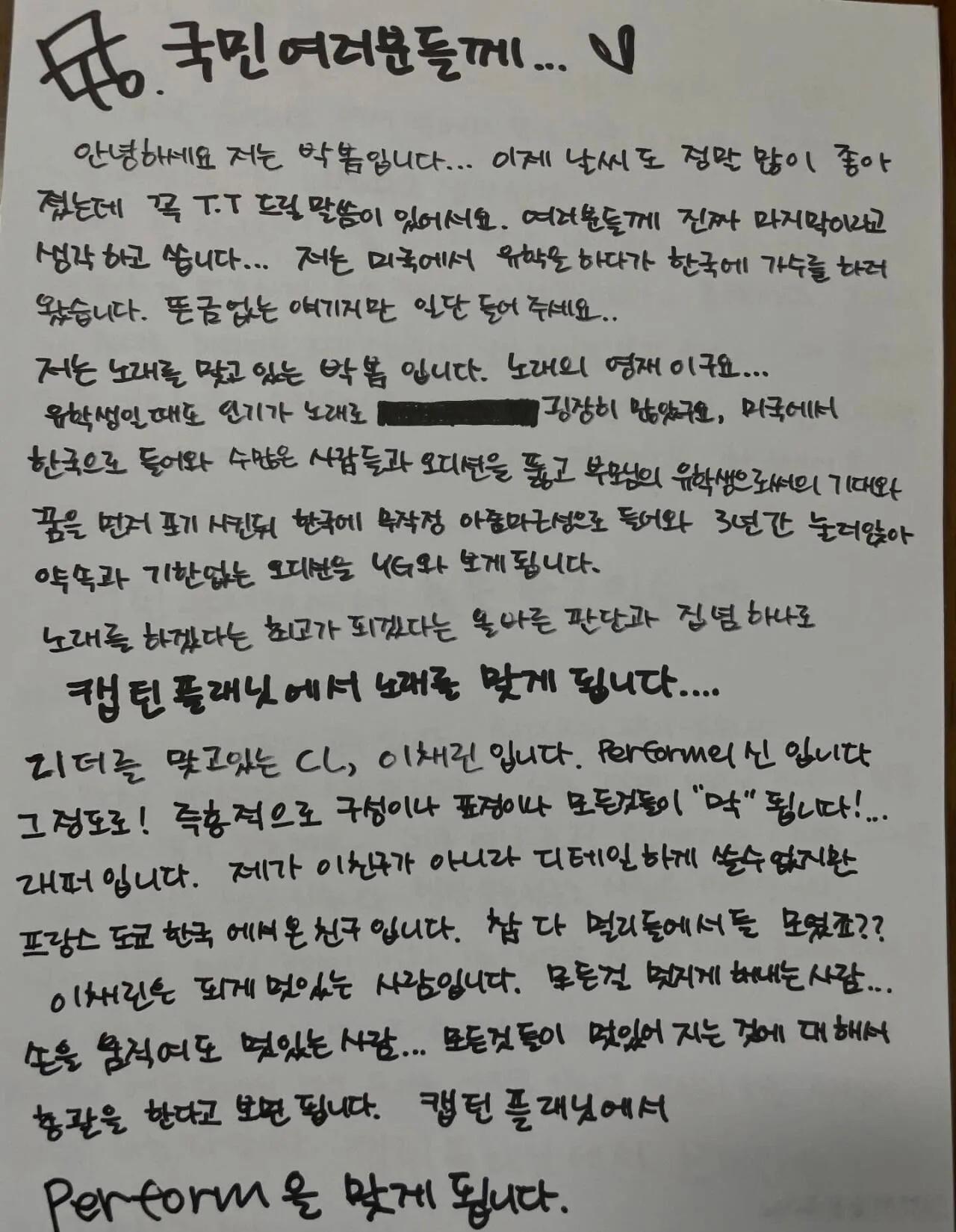 朴春手写信回应曝朴山多拉涉毒朴春手写信谈眼中的2ne1 17日,朴春ins发手写信谈眼中的2ne1,夸CL是“表演之神”、敏智让她感到自豪、自己本来就是朴山多拉的粉丝,最后,她希望大家能将自己“曝朴山多拉涉毒”的事情,当作从未发生。