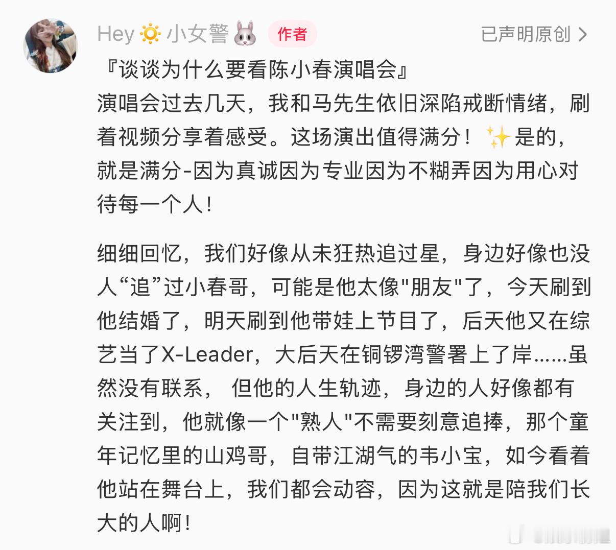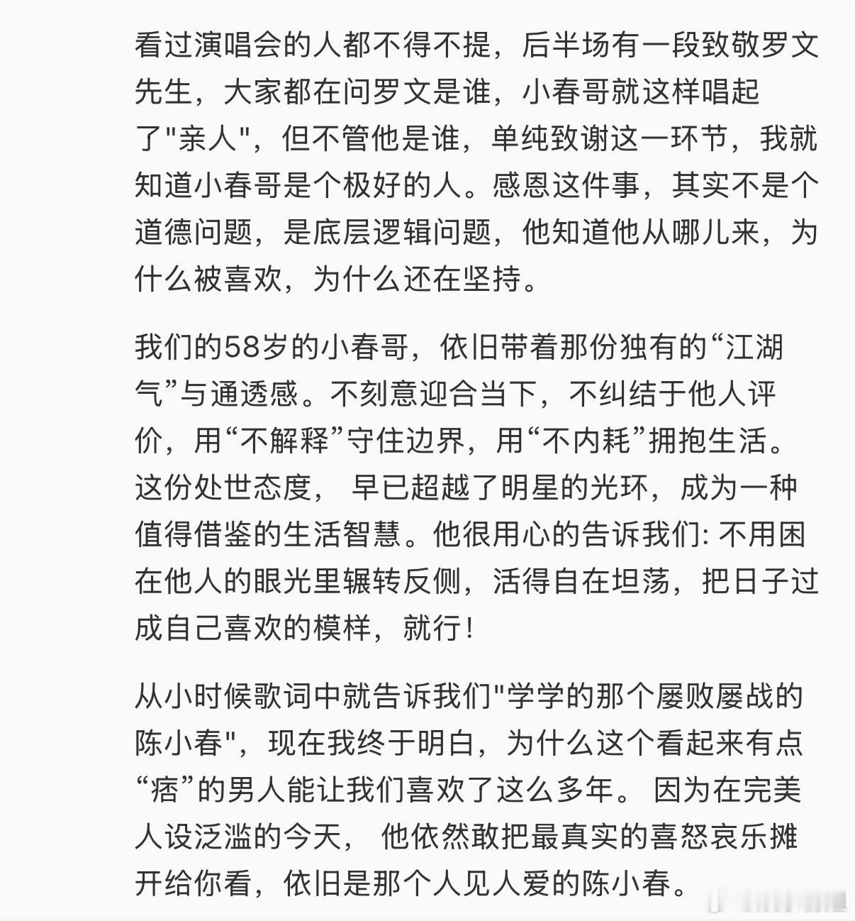 谈谈为什么要看陈小春演唱会陈小春演唱会反响 这场演唱会最戳人的是感恩与初心。后半场致敬罗文先生,一曲《亲情》唱尽情义,懂得来路、不忘提携,这份通透太难得。不刻意迎合、不纠结评价,用真实坦荡圈粉多年。江湖气里藏着温柔,舞台上拼尽全力,这就是我们爱他的原因!
