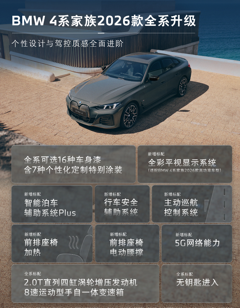 车若初见 2026款宝马4系家族正式上市,售价34.8-51.8万元,新增了锋芒限量版,全国限量200台。