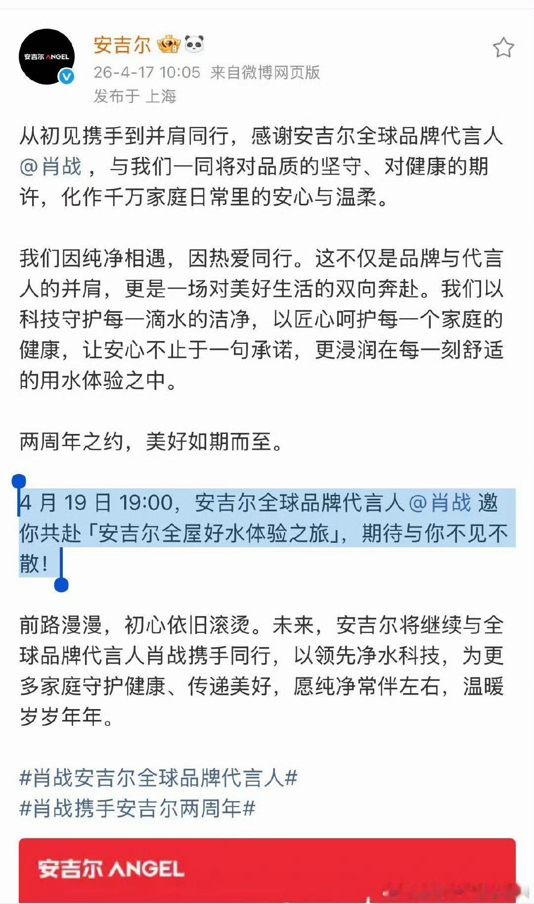 肖战安吉尔全球品牌代言人肖战与安吉尔续约了❗❗合作迈进第三年,优质品牌和优质代言人的双向奔赴成绩完全亮眼 肖战安吉尔全球品牌代言人 演员中top和净水机top强强合作都是第一