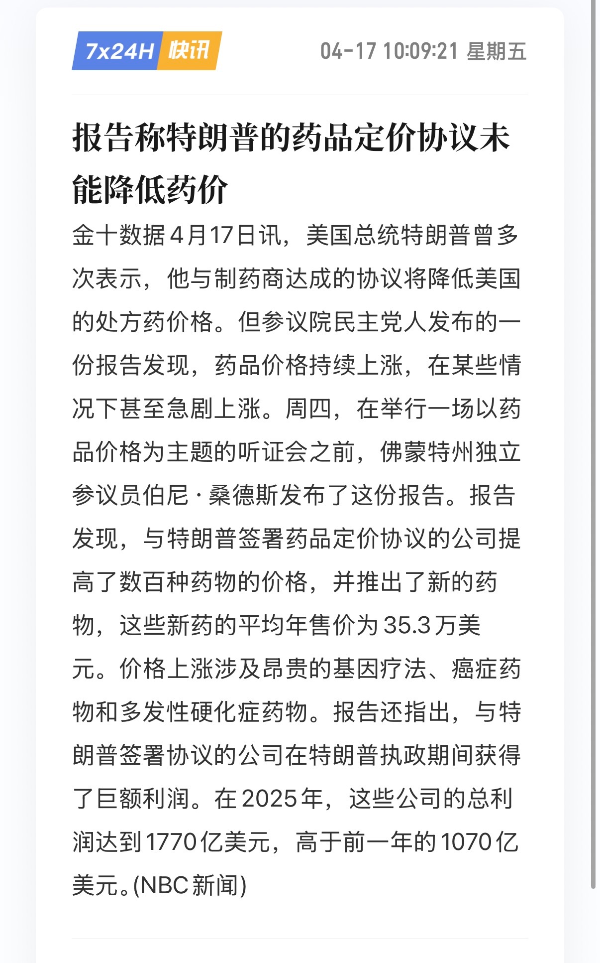 🔻报告称:特朗普的药品定价协议未能降低药价。特朗普称伊朗战事应该很快就会结束以