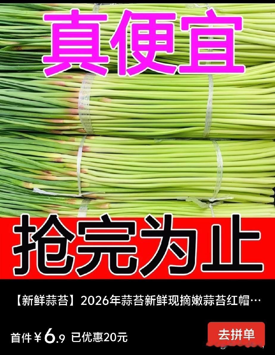这几天看到拼多多上蒜苔又开始大量上市了,前几天还十几块钱五斤呢,这两天就降到十元以内五斤了,我下单买了五斤,商家搞活动秒杀:五斤只要八块九毛钱,这个价位真够便宜了,还包邮,卖家也是实在太不容易了,这个价位基本上都是赚不到多少钱的,少赚点钱总比白给人强。 去年的这个时候也是这样,我妻子在郑州,她告诉我当地的蒜苔非常的好,价格低到不敢相信,有的邻居还给她送来不少呢,她不会加工,只好用保鲜膜包好了放在冰箱里存起来慢慢吃。 去年郑州的蒜农在网上发信息,地里的蒜苔随便拔,不要钱,谁拔的就归谁,因为现在蒜苔卖不出去,也卖不上价,如果蒜苔不能及时拔掉的话,蒜头就会因为有蒜苔争营养而长不大的,蒜苔卖不上价了,蒜农只能靠大蒜头赚钱了,雇人拔蒜苔就是赔钱,所以才会谁拔蒜苔就免费送了,这也是无奈之举了。 今年看到卖家介绍,蒜苔有好多种的吃法,还可以淹咸菜、做泡菜……看起来很美味呢。 马上新鲜美味的蒜苔就到货了,我也要淹上一些慢慢吃。