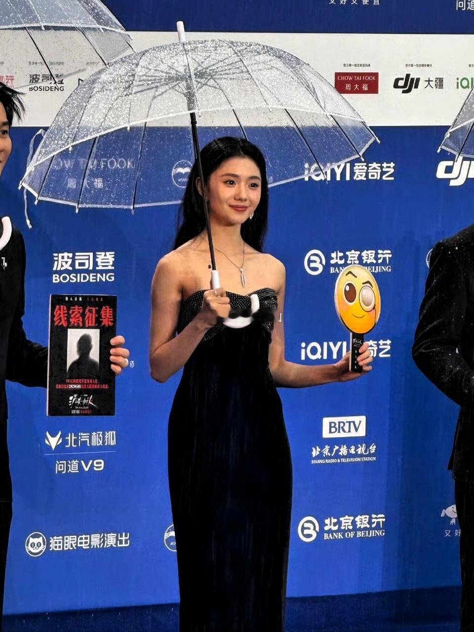 第十六届北影节,刘浩存穿黑丝绒抹胸长裙撑透明伞亮相,雨中红毯造型登热搜。