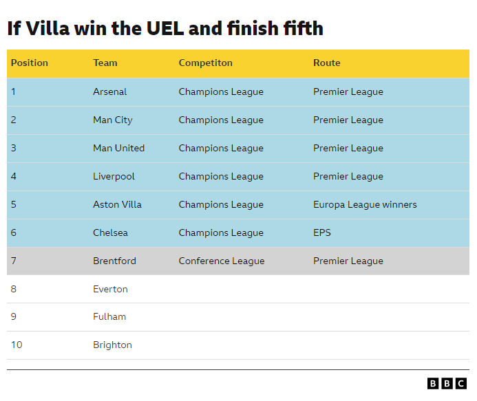 - 如果维拉夺冠但联赛无缘前四:英超将有6队参加欧冠,分别是:联赛前四 + 欧联杯冠军维拉 + EPS额外名额。