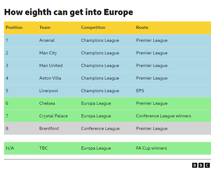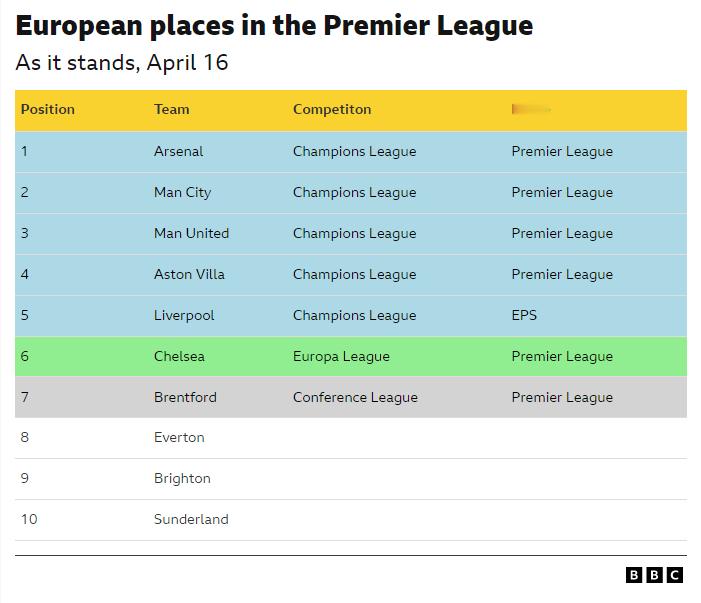 BBC:本周利物浦从欧冠出局,使得下赛季英超11队征战欧战的可能性基本破灭,但依然有机会实现10队入围。