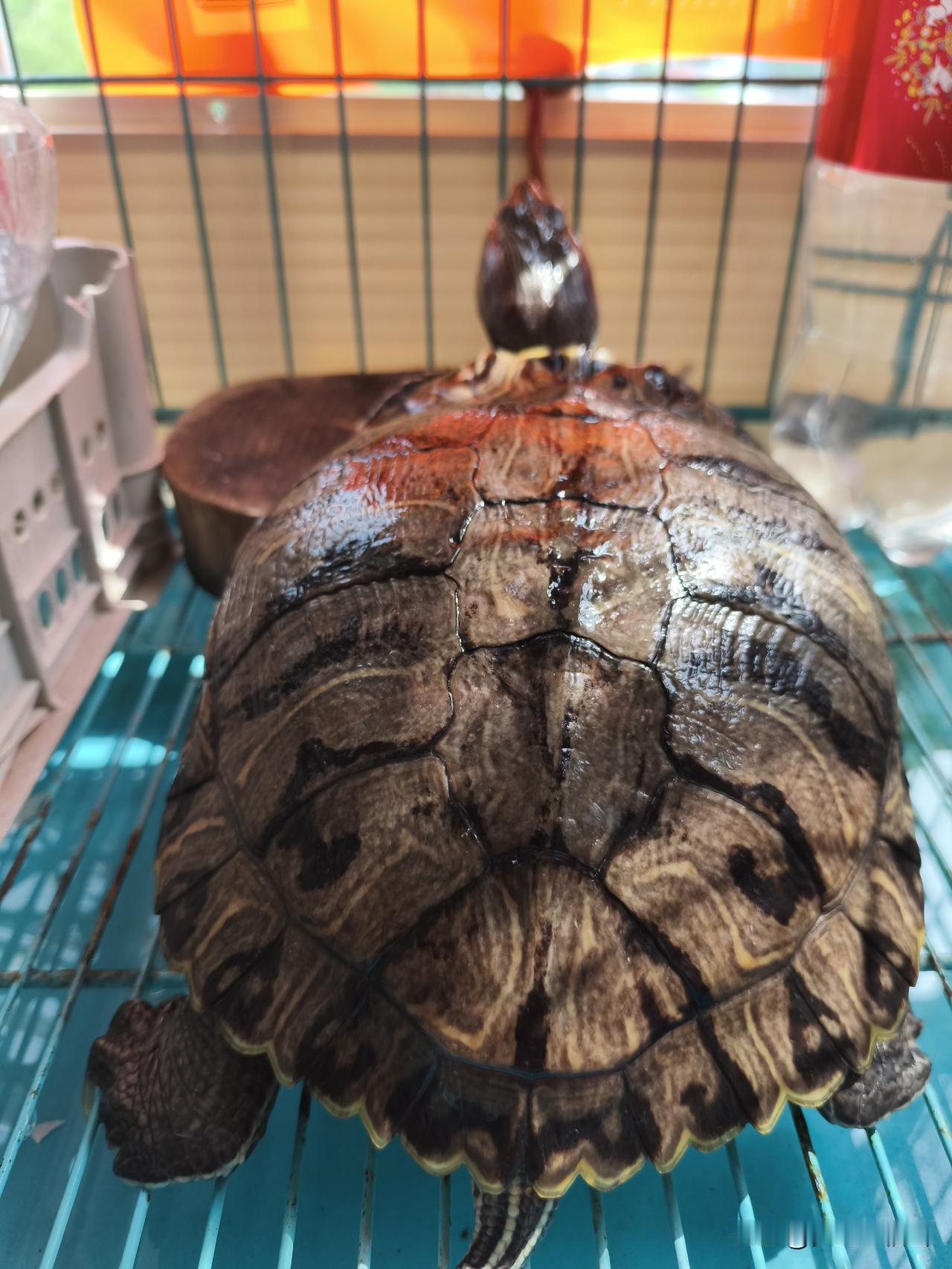 我家龟每天日常就是如此:早上放水池吃食、排便后再放到阳台防盗窗上的“天然游泳池”