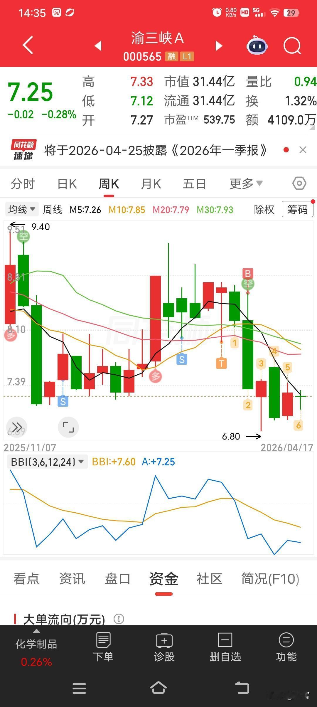 渝三峡A现在价格7.25,走势还行,想突破前高12块解套可不容易。从股权质押情况看,截止2026年3月6日质押总比例20.27%,质押总股数8790.00万股,这说明公司资金方面可能有点状况。而且2026年2月13日还发布了处置部分北陆药业股票的进展公告,这一系列操作对股价影响未知。股市风云变幻,啥时候能突破前高真不好说。或许得等公司业绩大幅提升,或者行业迎来利好,才有机会解套。只能多关注公司动态和市场行情,慢慢等啦。