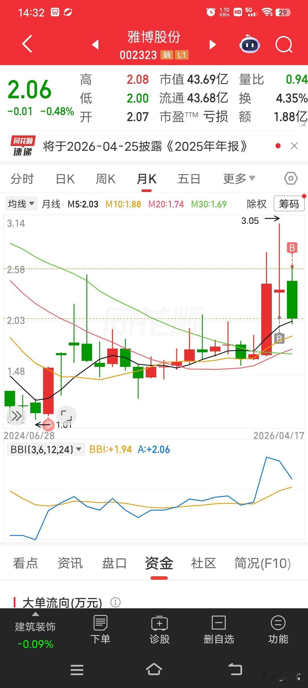 雅博股份这走势真是让人又爱又恨。最新价2.06,回调走势还弱,想回升涨停解套可太让人盼着了。之前它经历过“天地板”惊魂到反包涨停,那短线情绪就像坐过山车。本周五前走势还挺完美,均线多头排列、量价配合默契,谁能想到突然就来个极端单边下跌,很多追高的瞬间亏损12%,绝望透顶。 现在这回调弱的情况,啥时候回升涨停真不好说。得结合建筑装饰板块整体环境,还有背后资金运作逻辑。只能多关注着,祈祷市场给点力,让咱早日解套。