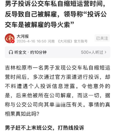 吉林松原,27岁男子在一家公司上班,每天下班需要赶公交回家,却紧赶慢赶总是赶不上公交,这才发现公交总是提前发车40分钟,他怀疑公交公司私自缩短运营时间,很气愤,于是将公交公司投诉了。谁知,问题没解决,个人信息还被泄露了。公交公司向其公司施压,导致他被公司解雇了,男子傻眼了。 吉林松原,27岁男子拿着解雇通知书,站在公司门口,整个人彻底傻眼,浑身僵硬,大脑一片空白。谁能想到,他只是因为每天下班赶不上公交,发现公交常年提前40分钟发车,气愤之下投诉公交公司,不仅没解决问题,个人信息还被泄露,最终被公交公司施压解雇,好好的工作就这样没了。 男子今年27岁,在松原当地一家公司上班,家离公司不远不近,公交是他每天上下班的唯一代步工具。他每天下班都不敢有丝毫耽搁,一到下班时间就飞速收拾东西,一路小跑赶往公交站点,可即便拼尽全力,却总是赶不上那班回家的公交。 一开始,他以为是自己跑得太慢,或是偶尔赶上公交临时调整发车时间,没太放在心上,只是每天更加匆忙,甚至提前几分钟下班,只为能赶上那班公交。可日复一日,他依旧次次错过,这让他心里渐渐起了疑心,决定一探究竟。 他特意提前半小时赶到公交站点,拿出手机计时,对照着公交站牌上标注的发车时间,静静等待。可让人没想到的是,距离标注的发车时间还有40分钟,那班他每天都赶不上的公交,竟然提前缓缓驶出了站点,丝毫没有按照规定时间运营。 确认自己没有看错后,男子心里的火气瞬间涌了上来。公交站牌明确标注了发车时间,公交公司却私自让公交提前40分钟发车,相当于变相缩短运营时间,不仅耽误了他的出行,想必也影响了其他乘客。越想越气愤,他当即决定投诉公交公司。 他按照公交站牌上的投诉电话,详细说明了情况,明确告知工作人员,自己乘坐的公交常年提前40分钟发车,怀疑公交公司私自缩短运营时间,希望能得到合理的解释和整改,还乘客一个公道。投诉时,他如实提供了自己的姓名和联系方式,方便对方反馈。 投诉之后,男子满心期待能得到回应,希望公交能恢复正常发车时间,自己也能不用再每天匆忙赶车。可一天天过去,公交依旧提前40分钟发车,投诉的问题没有得到任何解决,公交公司既没有联系他反馈,也没有任何整改的迹象。 就在他准备再次投诉的时候,意外发生了。他的公司领导突然找他谈话,语气严肃,告知他被公司解雇了,给出的理由含糊其辞,只说公司接到相关压力,不得不做出这个决定。男子一头雾水,不知道自己到底做错了什么。 再三追问之下,他才得知,原来是自己投诉的公交公司,通过某种渠道获取了他的个人信息,包括他的工作单位,随后向他所在的公司施压,要求公司将他解雇,以此报复他的投诉行为。得知真相的那一刻,男子彻底懵了,满心都是难以置信。 他怎么也没想到,自己只是合理维护自身权益,投诉公交公司的违规行为,竟然会落得这样的下场。个人信息被泄露,好好的工作没了,原本稳定的生活被彻底打乱,他站在原地,越想越委屈,却又手足无措,只能愣在原地傻眼。 事后他了解到,公交公司私自让公交提前发车、缩短运营时间,本身就属于违规行为,而泄露投诉人的个人信息,更是侵犯了公民的隐私权,向其公司施压导致其被解雇,更是错上加错。他保留了投诉记录和相关证据,打算进一步维权。 他原本只是想解决赶不上公交的小问题,却因为一次合理投诉,失去了工作,还遭遇了个人信息泄露的困扰。好好的职场人,只因维护自身权益,就被这样报复,这样的经历,任谁都会觉得气愤又无奈,也让人难以接受。 目前,男子已经准备向相关部门反映公交公司的违规行为和信息泄露问题,希望能讨回公道,挽回自己的损失。一次简单的投诉,却引发一系列连锁反应,不仅暴露了公交公司的违规操作,也让人心寒。 对此,你们有什么看法,欢迎评论留言~
