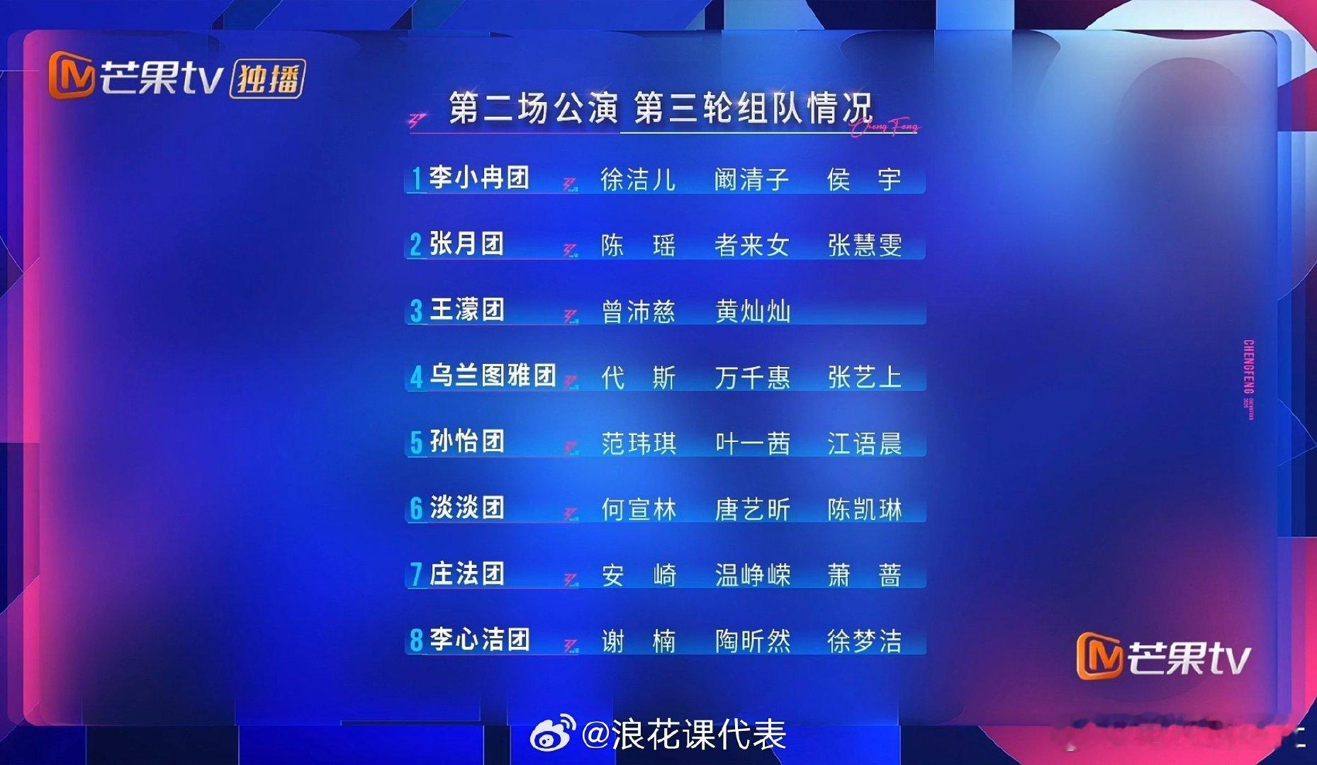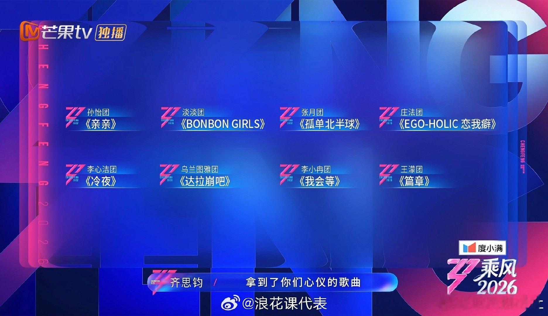 李小冉徐洁儿阚清子侯宇我会等庄法安崎温峥嵘萧蔷恋我癖《乘风2026》二公分组:【周五上半场】庄法、温峥嵘、安崎、萧蔷 《恋我癖》淡淡、何宣林、唐艺昕、陈凯琳 《bonbon girl》李心洁、谢楠、陶昕然、徐梦洁 《冷夜》孙怡、叶一茜、范玮琪、江语晨 《亲亲》【周六下半场】乌兰图雅、万千惠、代斯、张艺上 《达拉崩吧》王濛、曾沛慈、黄灿灿 《篇章》张月、陈瑶、者来女、张慧雯 《孤单北半球》李小冉、侯宇、徐洁儿、阚清子 《我会等》最期待哪一组的合作舞台?!