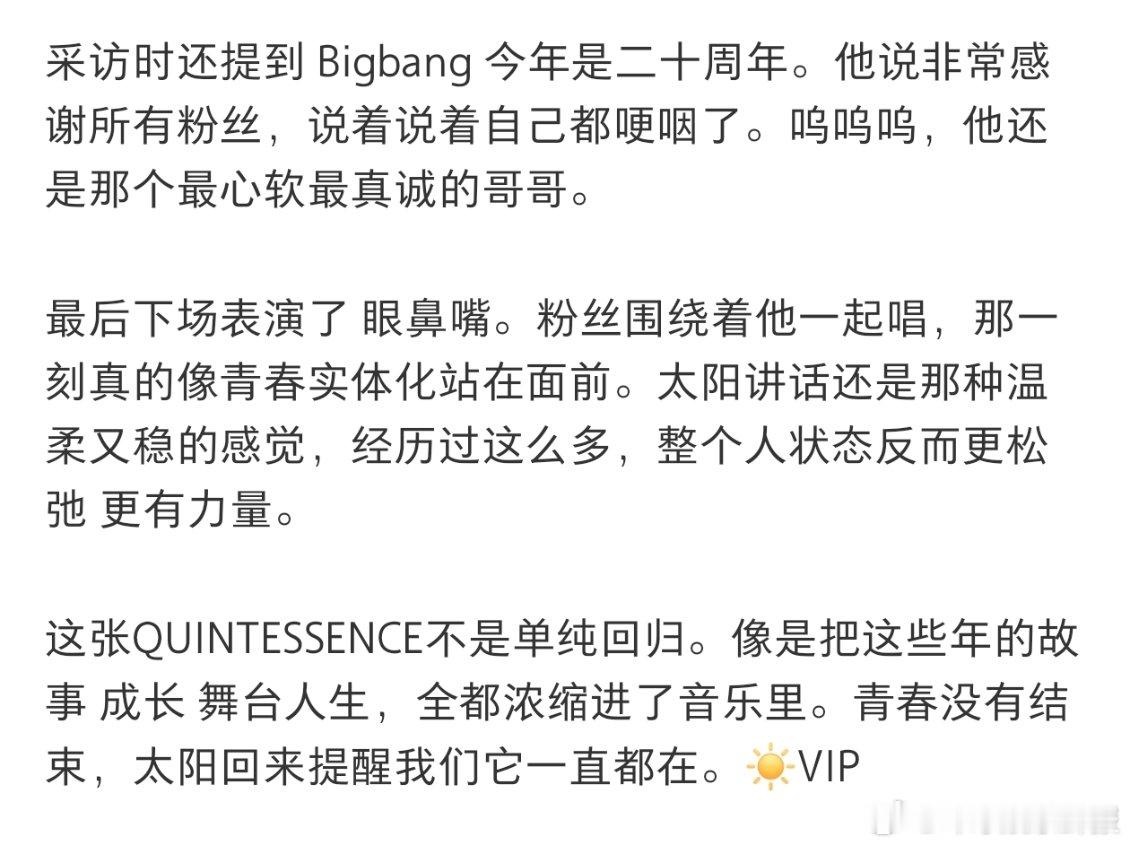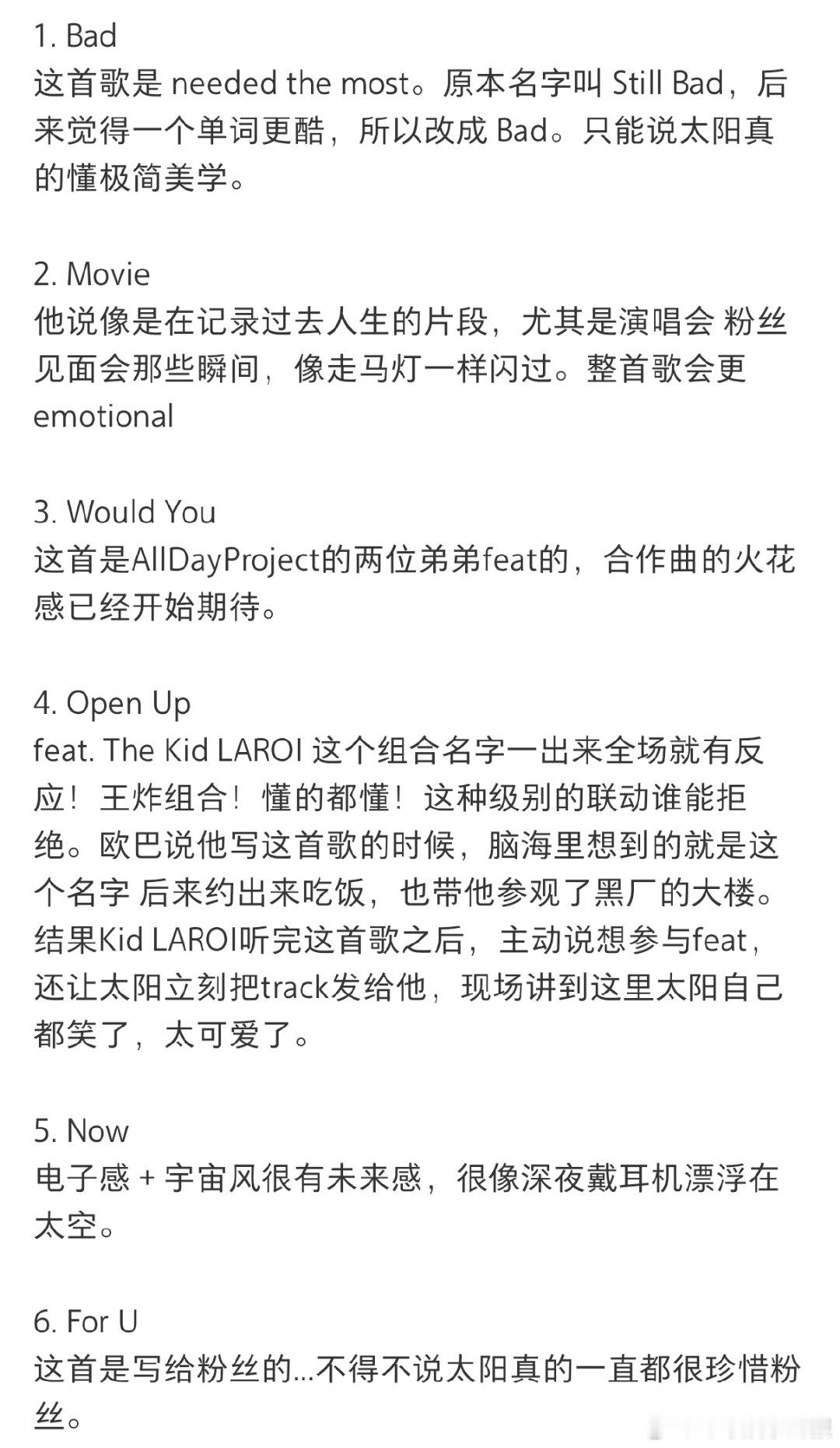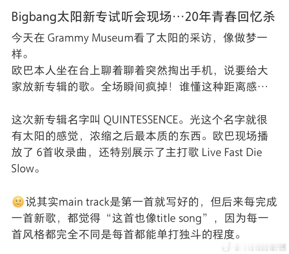 TAEYANG太阳新专试听会BigBang太阳新专试听会 BigBang太阳新专试听会分享,这次新专辑名字叫 QUINTESSENCE。光这个名字就很有太阳的感觉,浓缩之后最本质的东西。欧巴现场播放了 6首收录曲,还特别展示了主打歌 Live Fast Die Slow。话不多说,燥候🔥🔥🔥