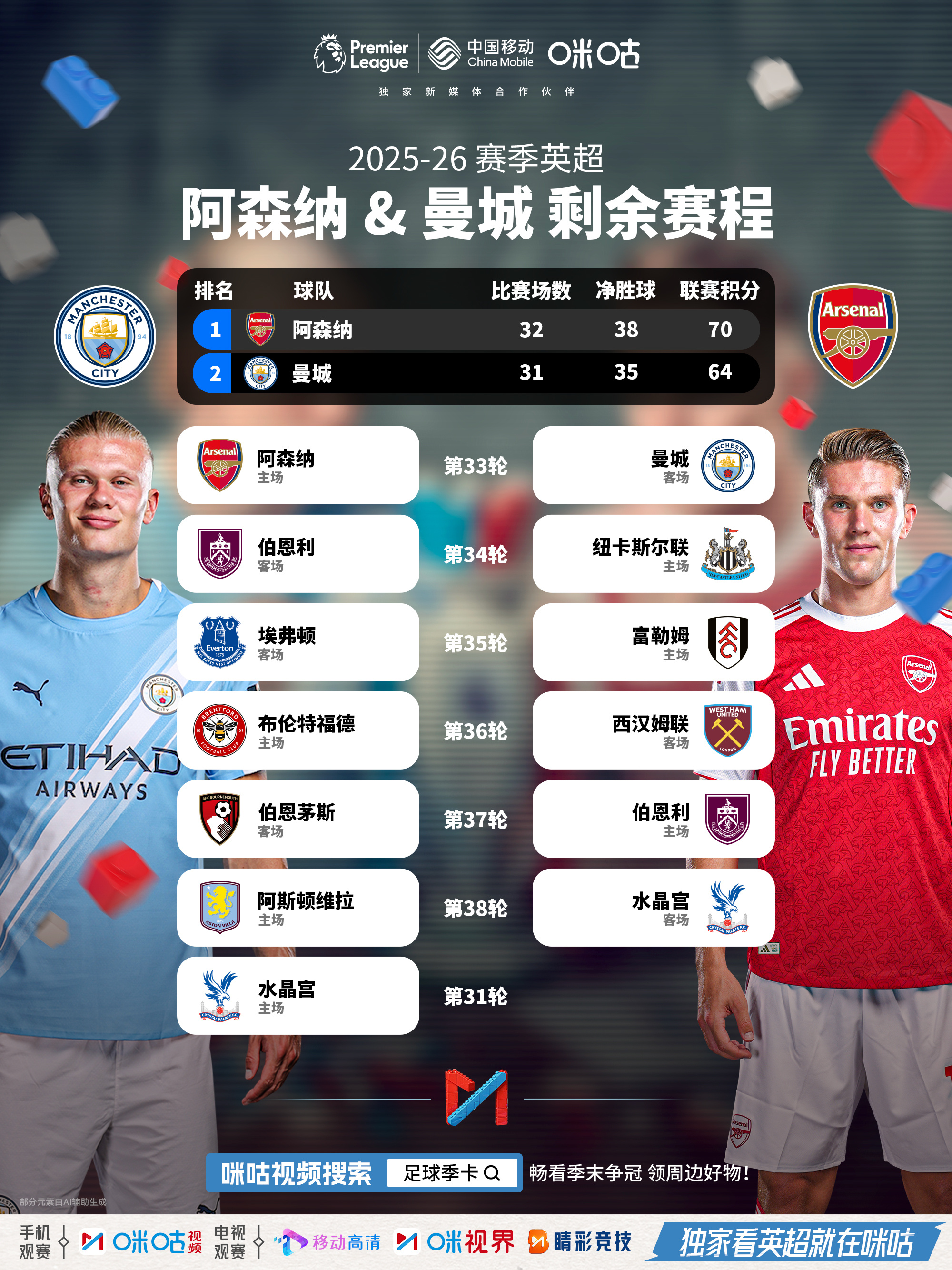 💥 英超「决赛」#曼城vs阿森纳#🏟️ 容错率几乎为零的生死局🏆 赛季冠军归属的终极推演⏰ 19日 23:30 《绝命争首》👀 #上咪咕看英超天王山之战##独家看英超就在咪咕#