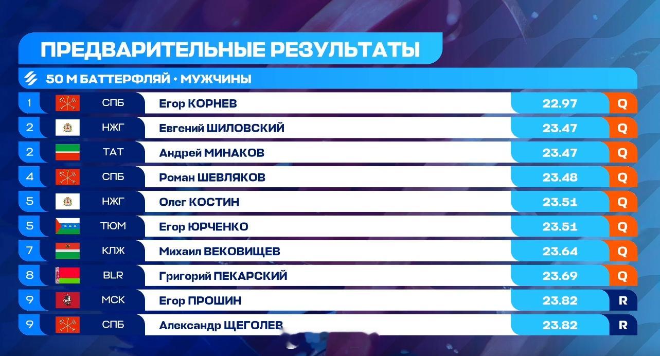 俄罗斯游泳杯总决赛 男50蝶预赛Egor Kornev 22.97 PB