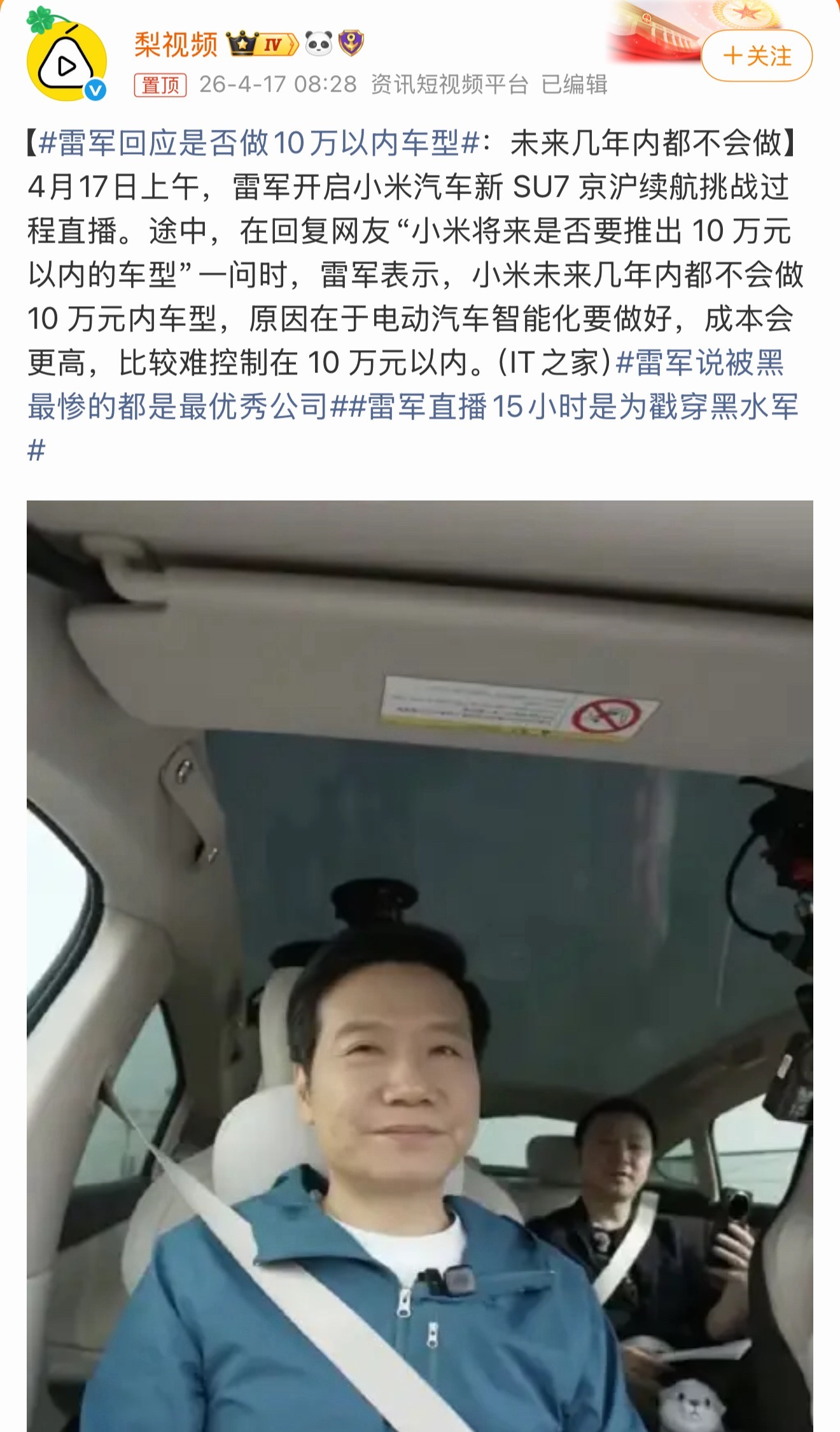 雷军回应是否做10万以内车型雷军这次直播说得挺实在。10万以下做智能化?硬件成本都压不住,强行上配置要么亏钱要么偷工减料,最后坑的还是用户。小米刚起步,没必要去跟比亚迪、吉利在低价市场硬碰硬,人家供应链玩了多少年,小米现在去卷价格,纯属找虐。