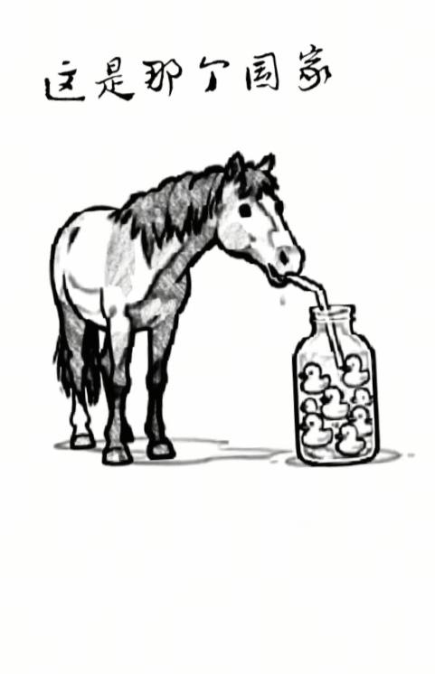 〔看图猜地名〕 图中画面贼可笑; 小马也能用吸管; 想吸瓶中的鸭子; 谐音猜个外国名; 此名共有四个字; 就等你来把它猜。