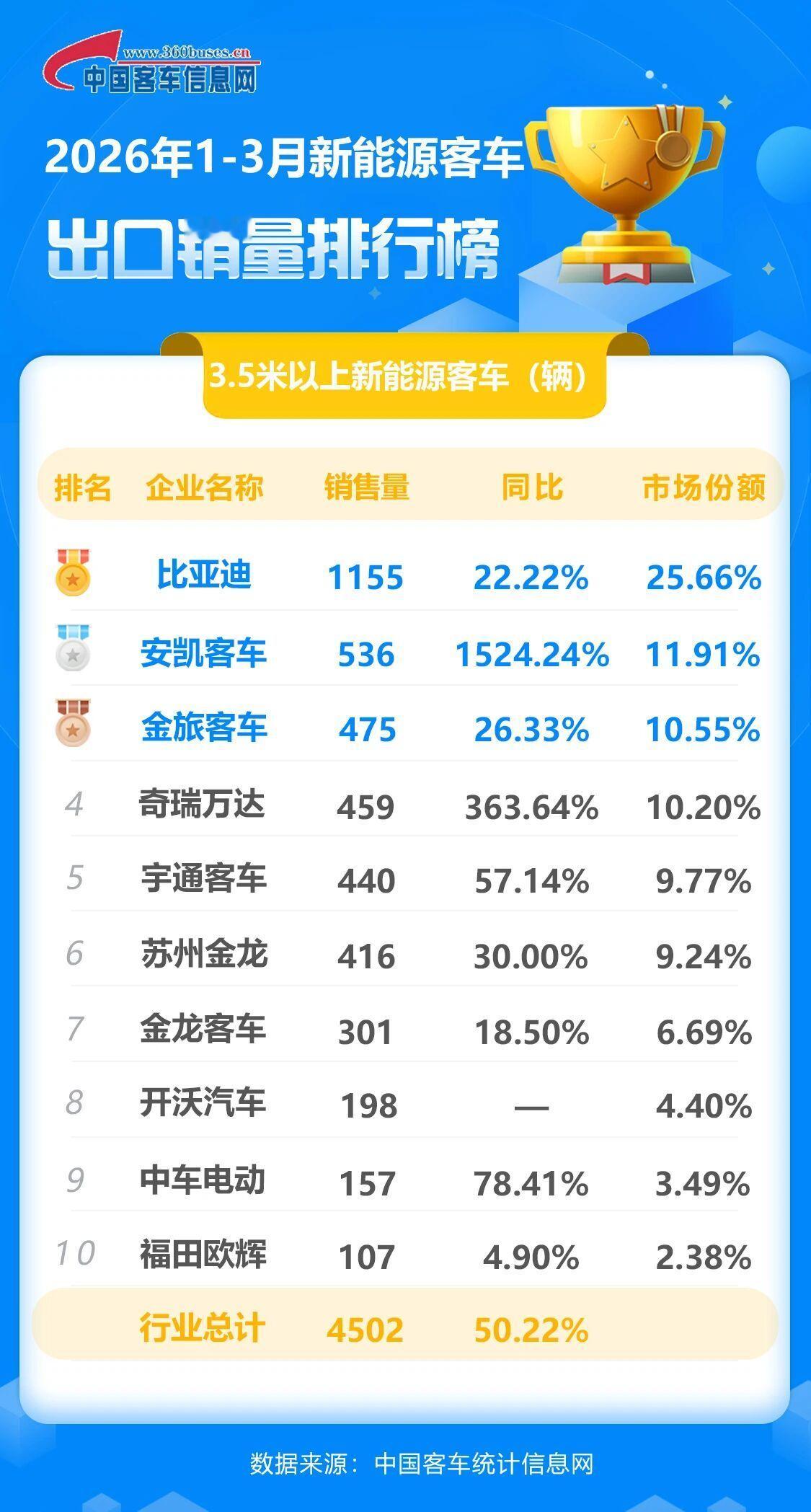 据中国客车信息网最新数据,2026年3月,比亚迪新能源客车出口同比增长21.52%,增速高于行业平均水平。2026年第一季度,比亚迪新能源客车累计出口1155辆,市场占有率为25.66%,是当期唯一出口量超过千辆的企业,连续三年在新能源客车出口量上排名第一。用实力加速全球公交电动化!