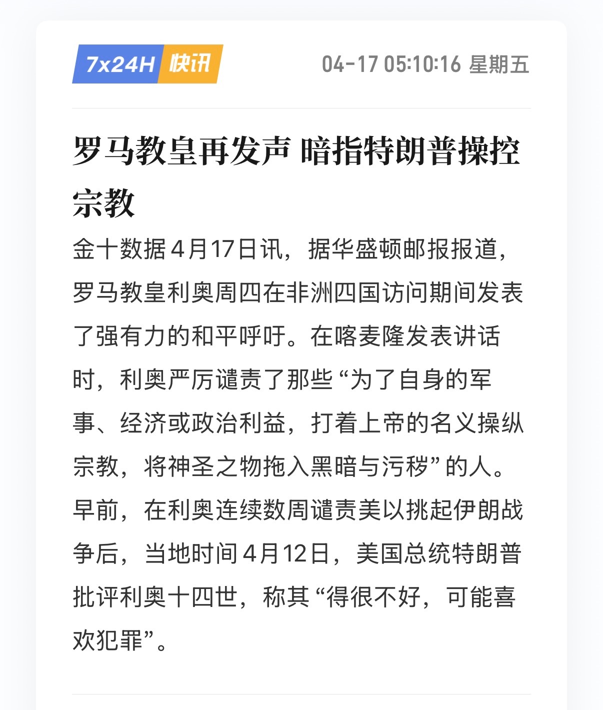 🔻教皇继续抨击特朗普政府。以色列剧本被撕了特朗普称伊朗战事应该很快就会结束海外