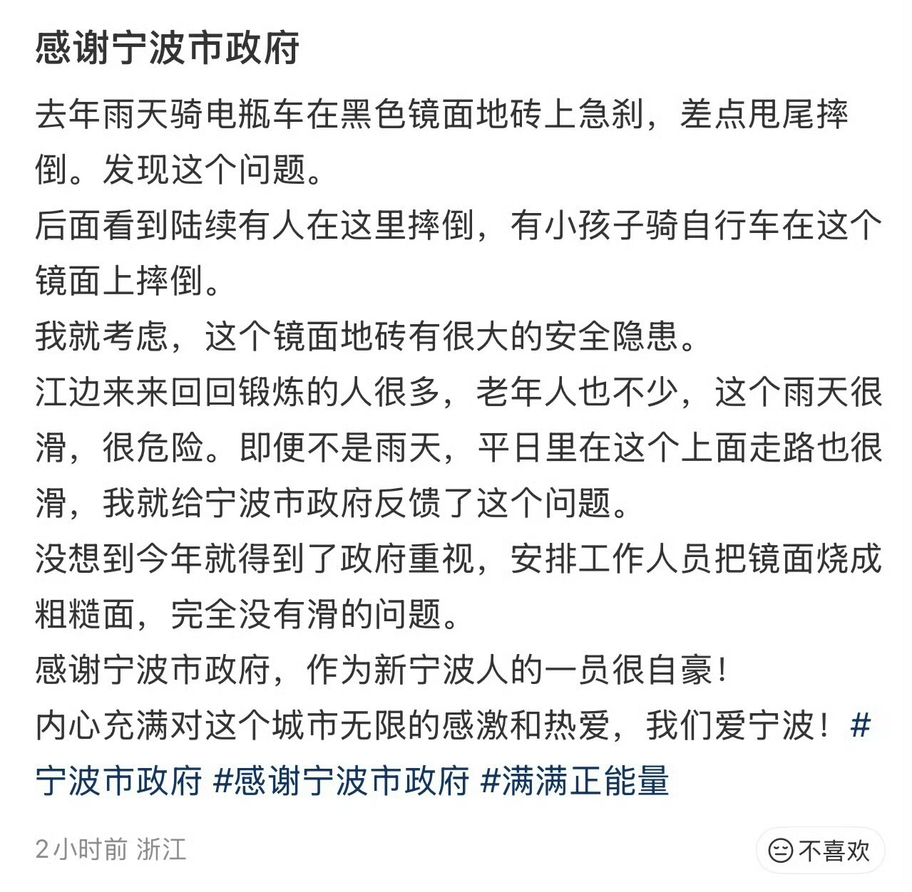 市民反映路面太滑宁波政府马上安排整改 网友“是团团妈妈呀”发帖感谢宁波市政府她说:去年雨天骑电瓶车在黑色镜面地砖上急刹,差点甩尾摔倒。发现这个问题。后面看到陆续有人在这里摔倒,有小孩子骑自行车在这个镜面上摔倒。我就考虑,这个镜面地砖有很大的安全隐患。江边来来回回锻炼的人很多,老年人也不少,这个雨天很滑,很危险。即便不是雨天,平日里在这个上面走路也很滑,我就给宁波市政府反馈了这个问题。没想到今年就得到了政府重视,安排工作人员把镜面烧成粗糙面,完全没有滑的问题。感谢宁波市政府,作为新宁波人的一员很自豪!内心充满对这个城市无限的感激和热爱,我们爱宁波!