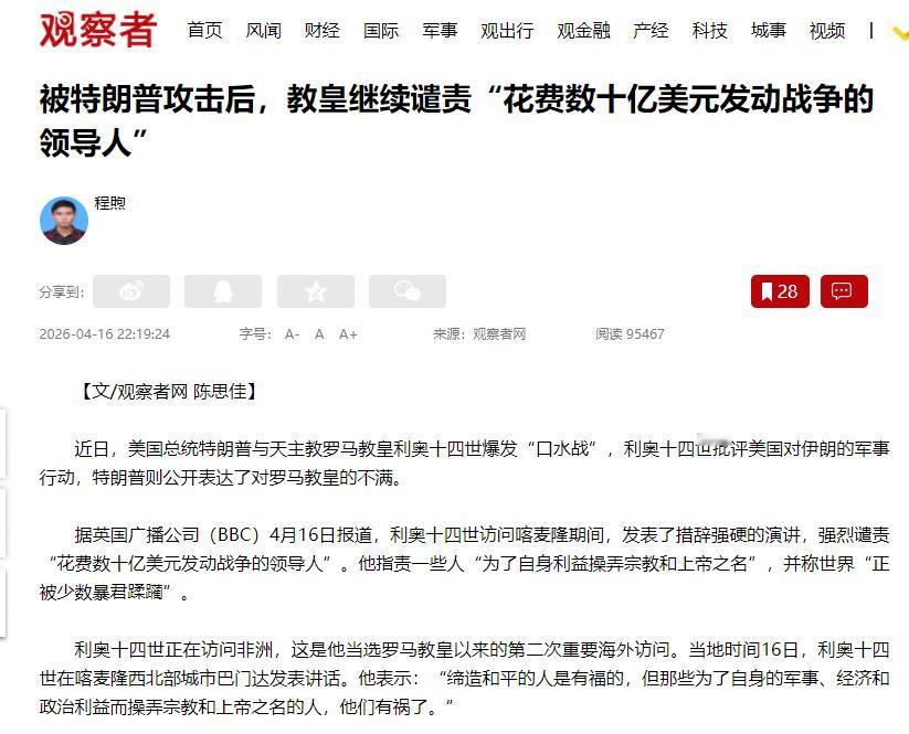 美国总统特朗普和罗马教皇利奥十四世,公开吵起来了。 教皇先批评美国打伊朗,特朗普不服气,直接公开表达不满,相当于当面回怼。 本以为教皇会软一点,没想到人家根本没服软,4月16日访问喀麦隆时,又发表强硬演讲,接着骂那些花几十亿美元打仗的领导,还说有人拿宗教、拿上帝当幌子谋私利,直言现在的世界,正被少数暴君欺负。 有人可能会问,教皇不是宗教领袖吗?还是美国籍,咋不跟自己国家的总统站一边,反而处处怼特朗普?还有,美国打伊朗到底花了多少钱,能让教皇反复念叨? 先说说这俩人,都很简单。特朗普咱们都熟,美国现任总统,脾气直,爱较真,谁批评他的政策,他立马就怼回去,从不藏着掖着。 教皇利奥十四世,2025年5月当选,是第一个美国籍教皇,在秘鲁待过很多年,见过内战的苦,所以特别反对战争,为人也实在,不说空话。 一开始特朗普还挺欢迎他,教皇当选时,特朗普还在社交平台祝贺,说这是美国的大事,还盼着见面。谁能想到,不到一年,俩人就闹掰了,核心就是美国打伊朗这事儿。 美国打伊朗不是突然的,2026年2月底,美国和以色列一起,对伊朗发动了大规模军事行动,花的钱简直是天文数字。 有专家算过,每天就得花5亿美元,打了五周,最少花了200多亿,最多可能到300多亿。五角大楼也说,单上周就花了110亿,这笔钱差不多能造一艘航母了。 教皇之所以批评,就两点:一是反对战争,二是看不惯美国拿宗教当幌子。之前美国国防部长呼吁民众,以耶稣的名义,为美国在中东的胜利祈祷,教皇特别不满,说有些打着基督教旗号的事,根本不符合教义,上帝教我们救生命,不是毁生命。 后来他更直接,批评特朗普“摧毁伊朗”的说法不能接受,特朗普一听就火了,俩人的口水战就这么爆发了。 有人会问,教皇就不怕特朗普报复吗?其实他有足够的底气。教皇是全球14亿天主教徒的领袖,握有道德权威,特朗普再不满,也得争取天主教徒的支持,不敢轻易动他。 而且现在更多美国人支持教皇,美国国内的天主教领袖也都站在教皇这边,特朗普没辙。 特朗普生气也能理解,他觉得打伊朗是为了美国在中东的利益,教皇批评就是拆他的台,不仅影响他要战争预算,还丢面子。 加上之前他开玩笑说想当教皇,发了张自己穿教皇衣服的AI图,被天主教徒骂侮辱信仰,现在又被真教皇批评,心里更窝火。 说到底,这不是俩人的私人恩怨,就是立场不一样。教皇站在和平的角度,反对战争、反对拿宗教谋私利。 特朗普站在美国利益的角度,想靠打仗巩固地位。俩人的矛盾,就是有人想争利益,有人想求和平。 对普通人来说,不管是总统还是教皇,最盼的就是少点战争、多点和平,毕竟打仗烧钱,受苦的还是老百姓。
