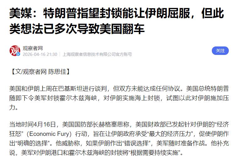 当地时间4月16日,美国又对伊朗下狠手了。 美国国防部长赫格塞思直接放话,美国财政部搞了个“经济狂怒”行动,说白了就是往伊朗经济上捅刀子,逼伊朗听美国的。 他还撂下狠话,伊朗要是敢不听话,美军随时能开战,而且要一直封锁伊朗港口和霍尔木兹海峡,直到美国满意为止。 同一天路透社也说了,美军把封锁范围扩大了,以前可能只拦点关键东西,现在倒好,武器、弹药、原油、成品油,还有钢铁、铝这些工业必需的东西,全不让过,摆明了要把伊朗的对外通道堵死。 CNN也分析,特朗普心里打得算盘噼啪响,觉得伊朗靠石油吃饭,一封锁就没钱了,只能乖乖服软。 可明眼人都知道,这想法纯属瞎琢磨,美国用这招对付别人,已经好几次翻车了,这次也照样成不了。 可能有人会问,特朗普为啥非要跟伊朗死磕,还非得用封锁这招?其实很简单,伊朗地理位置关键,手里还有不少石油,还一直不听美国的话。 美国想在中东说了算,就得拿捏住伊朗,要么让它听话,要么削弱它。特朗普觉得,伊朗的钱全靠卖石油,而石油要运出去,必须走霍尔木兹海峡,一封锁,伊朗卖不出石油、赚不到钱,老百姓日子过不下去,政府就只能妥协。 可特朗普想错了,伊朗根本不是软柿子,而且美国这招早就不好使了。美国一宣布封锁,伊朗就硬气回怼,说封锁肯定会失败,还说要把霍尔木兹海峡牢牢控制住,军队也进入了最高戒备,放话说谁敢动伊朗港口,整个波斯湾的港口都别想安宁。 更关键的是,伊朗早就有对策,用“暗航”的方式绕开封锁,把石油运到马来西亚再转卖,截至4月13日,都已经运出去2000万桶了,美国纯属白忙活。 更可笑的是,美国这封锁,不仅没伤到伊朗,反而连累了自己和别人。霍尔木兹海峡是全球最重要的石油通道,全世界五分之一的石油都从这过,沙特、阿联酋这些国家的石油也得从这运。 美国一封锁,油价肯定涨,到时候美国老百姓加油、买东西都得花更多钱,最后亏的还是自己。 连美国的盟友都不支持它,英国、欧盟都反对,西班牙更是直接批评它没道理,美国这下彻底孤立了。 其实美国用封锁逼别国服软,早就栽过好几次跟头了。最典型的就是古巴,美国封了古巴60多年,让古巴损失了上千亿美元,可古巴从来没服软,反而越来越硬气,美国还落了个霸道的名声。 除此之外,美国还封过朝鲜、委内瑞拉,没一个成功的,反而丢了不少贸易机会。 特朗普明明知道这招没用,为啥还非要干?说白了就是为了拉选票、树形象。现在美国国内通胀高,老百姓怨气大,特朗普想靠对伊朗强硬,让美国人觉得他有本事,好为自己的政治利益铺路,还嘴硬说美伊谈判快成了,其实伊朗根本没理他,纯属自吹自擂。 总结下来,特朗普这次的“经济狂怒”,就是一场自导自演的闹剧。他以为封锁就能逼伊朗服软,却忘了伊朗有对策、国际社会不支持,更忘了自己之前好几次翻车的教训。 现在的世界早就不是美国一家说了算,靠封锁、靠威胁,只会让人反感,特朗普的如意算盘,这次肯定又要落空,搞不好还得再栽个大跟头。