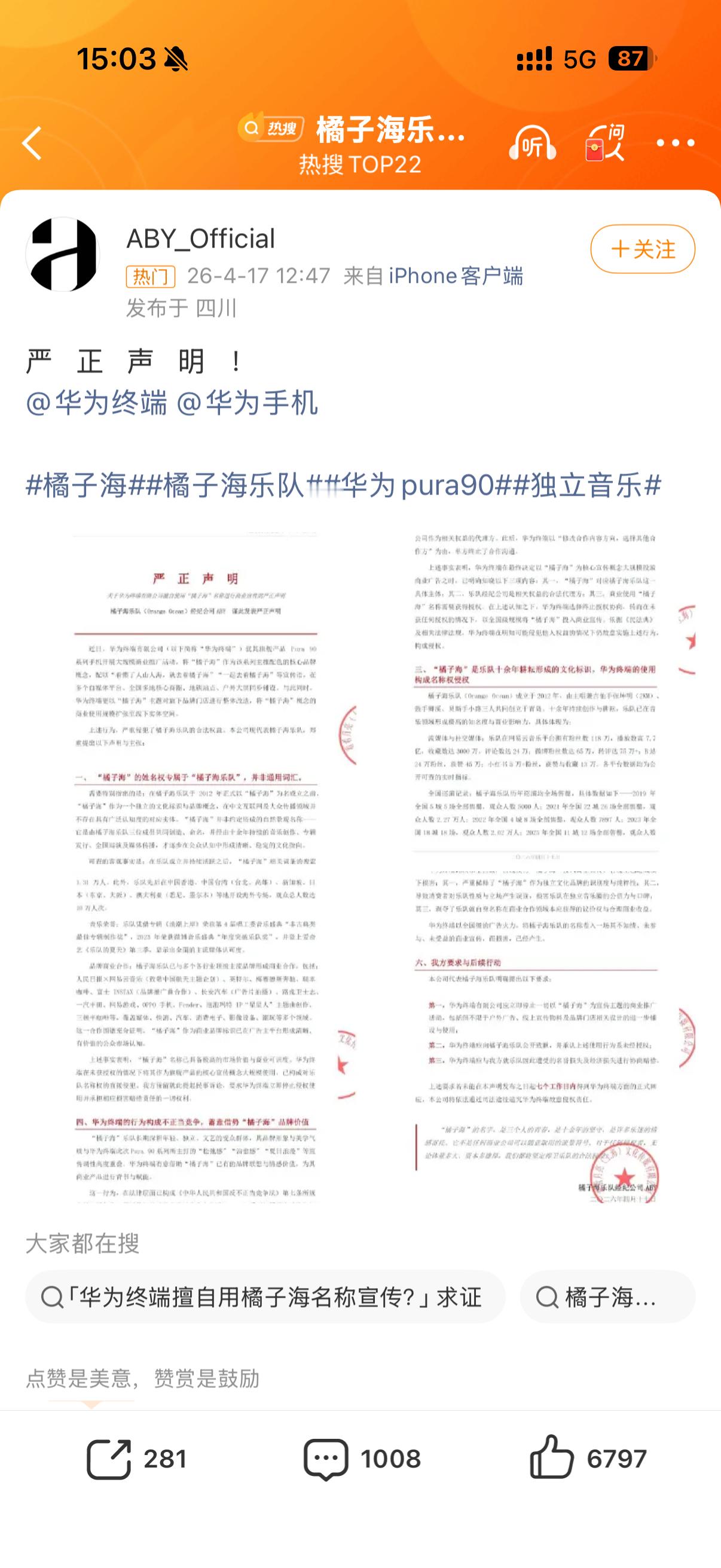 橘子海乐队称华为侵权乐队天真了昂,本来合作是一个锦上添花的好事情,但是没谈拢华为又敢这么宣传,说明公司内部经过了法务讨论的,一定是风险极低的,别小看这些厂商,不会知法犯法的。还有这种谈崩了,出来再跳一次也影响和其他品牌的链接问题,激动了天真了。