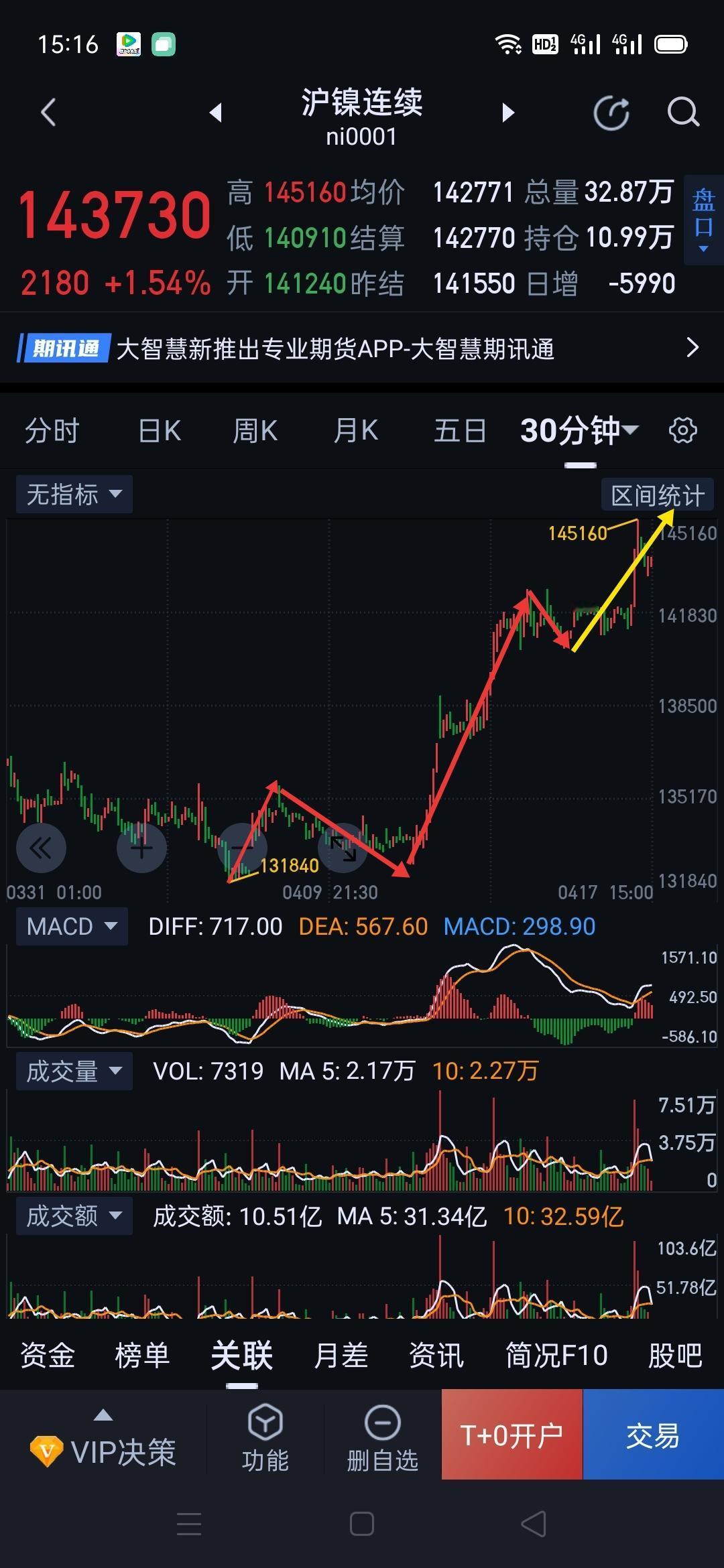 沪镍,守得云开见月明。 沪镍日盘,摆脱图(1)中枢束缚,继续向上拓展空间。 沪镍夜盘,需观察从145160开始的五分钟一笔下能否在图(1)中枢上方企稳。若在中枢上方企稳,将构成该中枢的三买结构,后市图(2)仍将以三十分钟线段走势继续生长。若沪镍夜盘回到图(1)中枢,后期围绕该中枢将会生长成更大级别的震荡。 沪镍,今天的上攻是量变到质变的过程。几个月隐忍,今朝破茧成蝶。沪镍目前走势已脱离图(3)中枢的牵制,为后期突破阶段高点152300创造了有利条件。雄关漫道真如铁,而今迈步从头越。