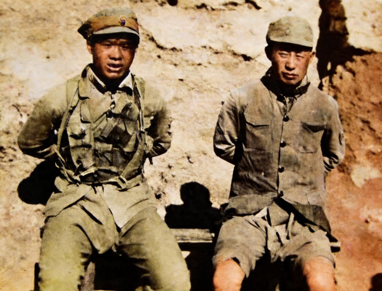 这是抗战时期两名八路军战士在战场上不幸被俘虏。从这两名八路军战士的精气神与身体素质,他们应该是身经百战的战士。 两名八路军战士穿着军装,双手被绑缚在身后,被迫坐在一条长凳上。虽然,两名八路军战士深知被日寇俘虏后的结果,但他们面对日寇的镜头不仅没有表现出丝毫的胆怯与恐惧,还很镇定自若,表现出一副视死如归的气魄。 在战场上,八路军与日寇之间都互有俘虏,但双方对待俘虏的方式相差悬殊。抗战战士被日寇俘虏后极大可能成为他们练习射击与刺杀的“靶子”。 八路军俘虏日寇后会先对他们实行思想教育。许多日军俘虏被八路军进行思想教育后成为反战战士,站到八路军这一边。他们帮助八路军翻译日语,书写日语标语。